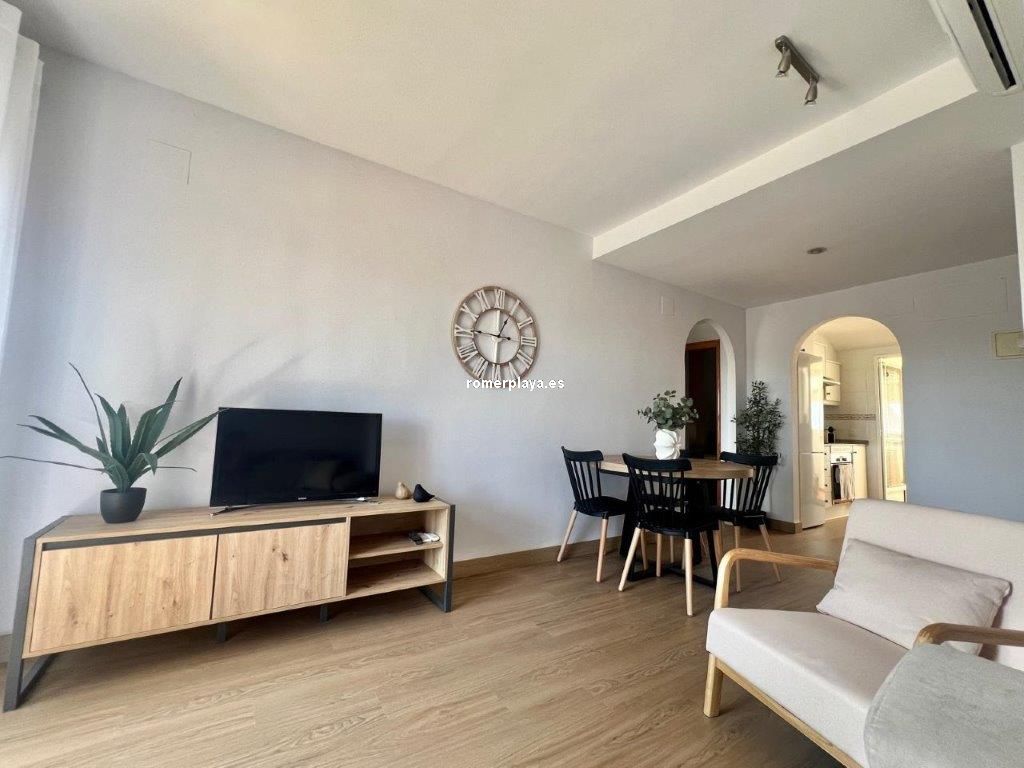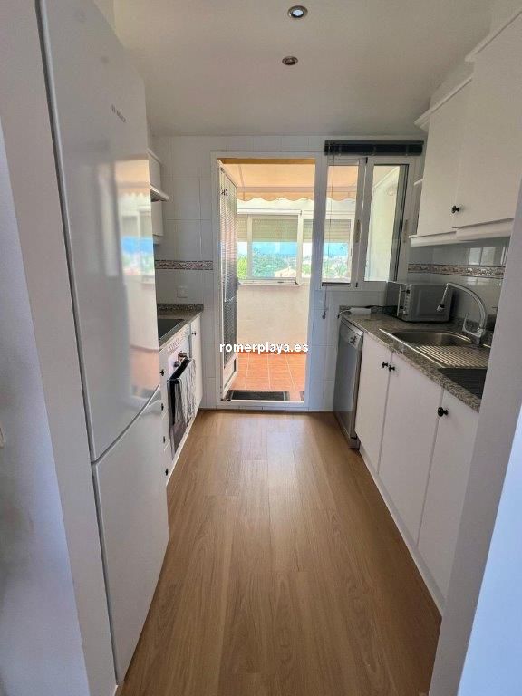 Ático en km2 de las marinas a 500 metros de la playa, tiene orientación sol de mañana con lo que es muy agradable estar y disfrutar de las bonitas vistas al castillo y a la montaña, dispone de ascensor y tiene dos habitaciones, un baño completo , cocina independiente con galería acristalada, salón comedor con salida a la terraza bonita y espaciosa, soleado todo el año, hay una plaza de parking numerada y piscina con jardín comunitario.