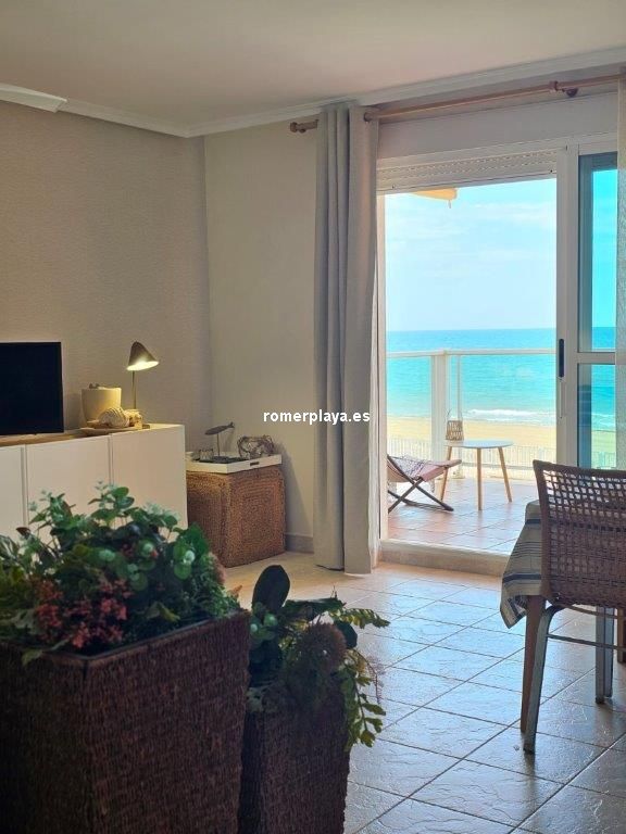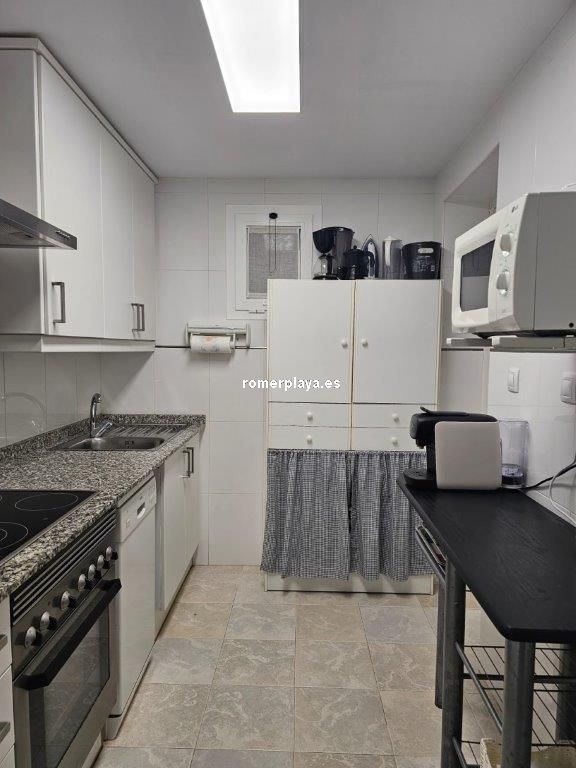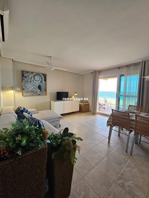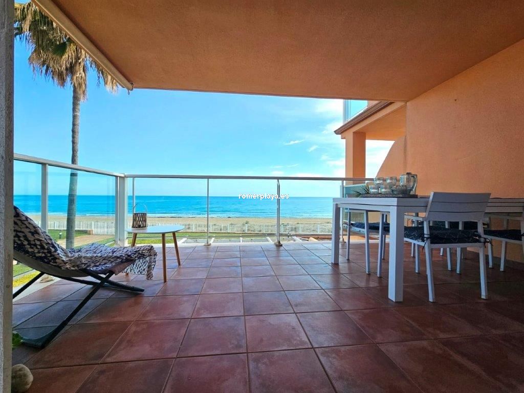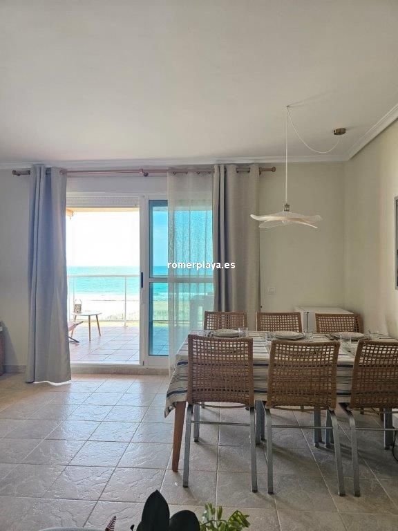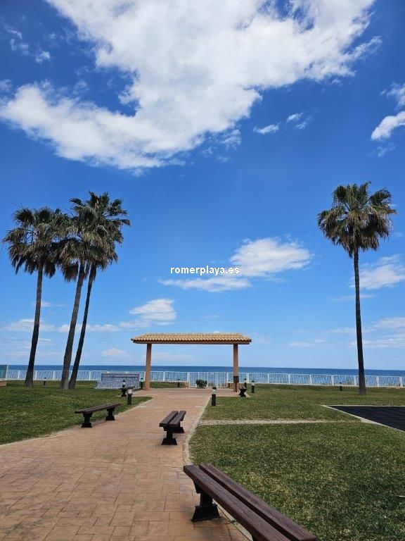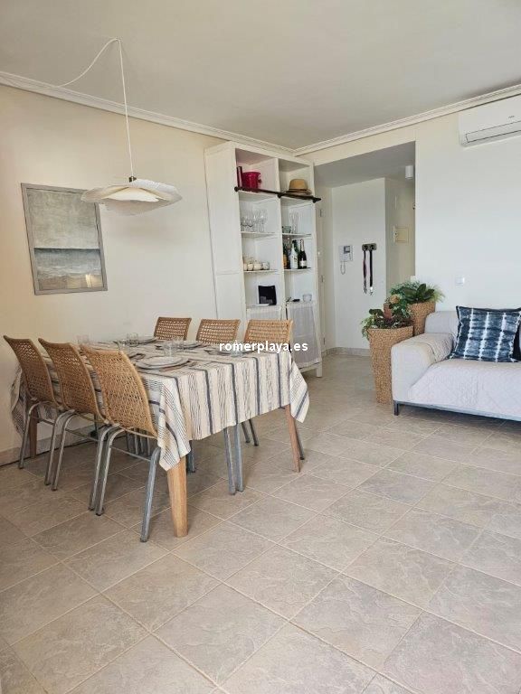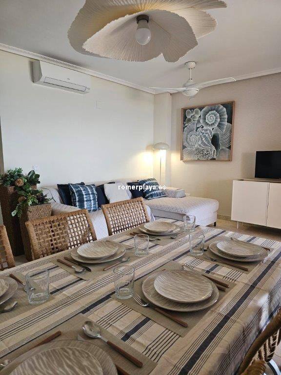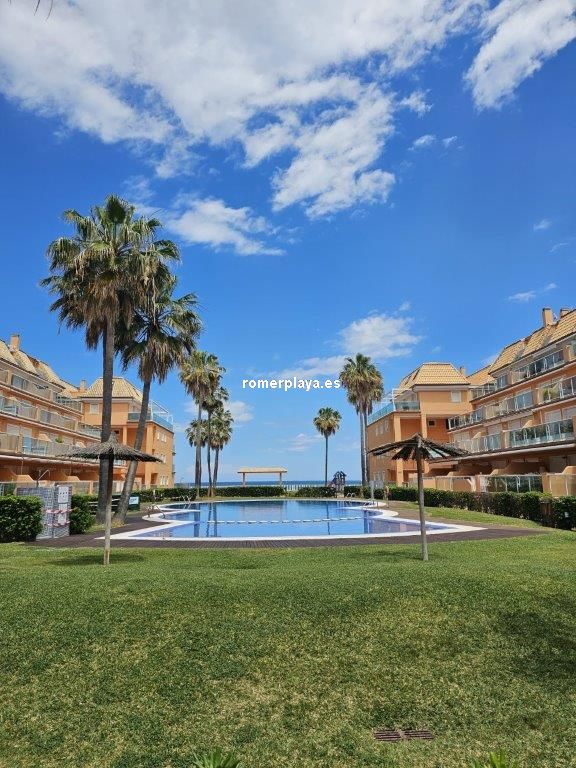 Apartamento en 1ª planta de 3 dormitorios 2 baños con vistas frontales al mar. Completamente equipado, cocina independiente con galería, plaza de garaje incluida. Ascensor , aire acondicionado frio calor.