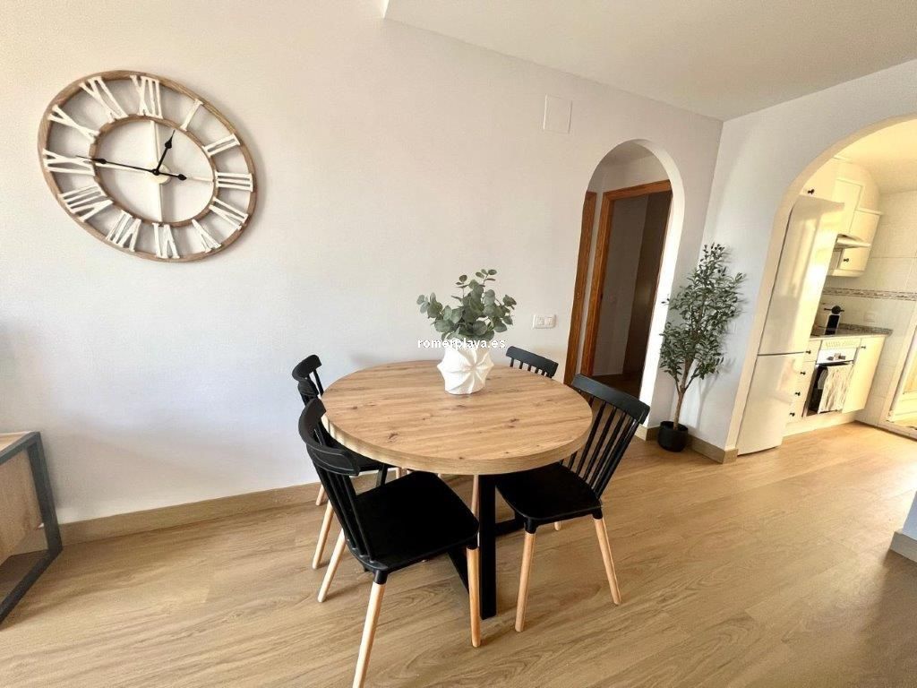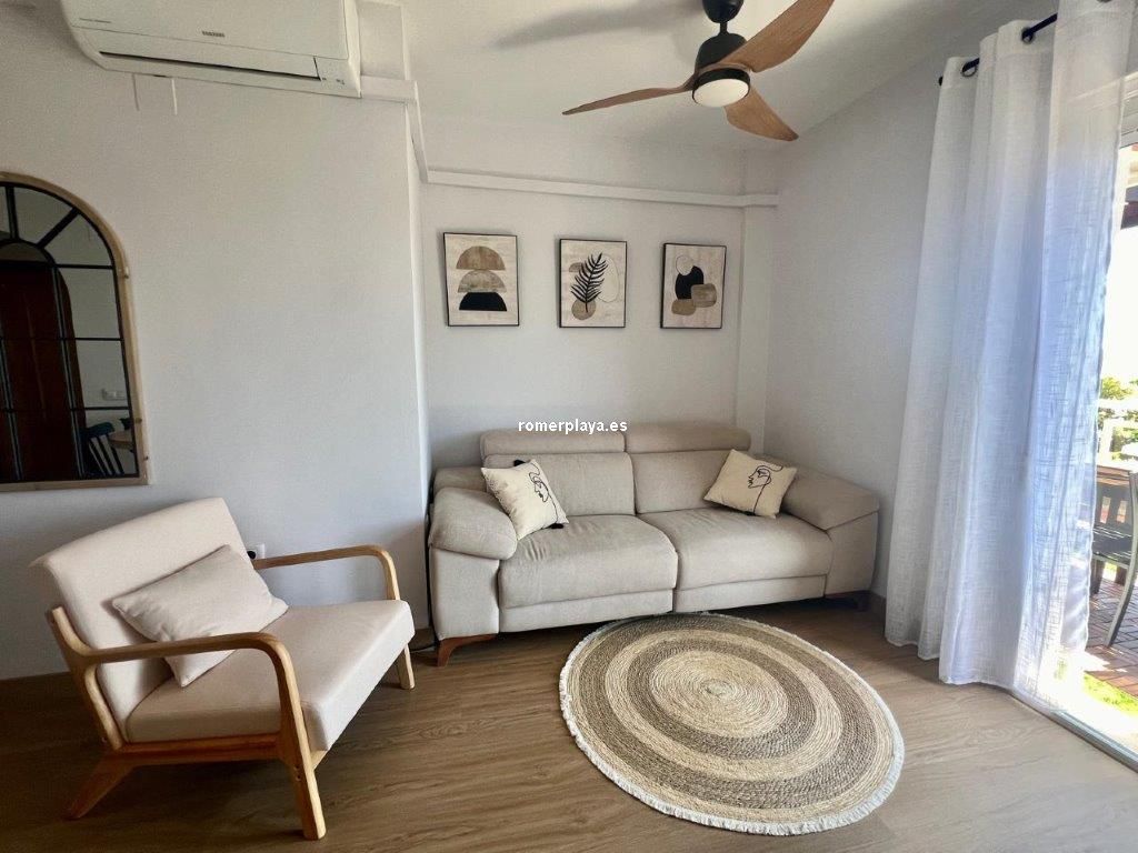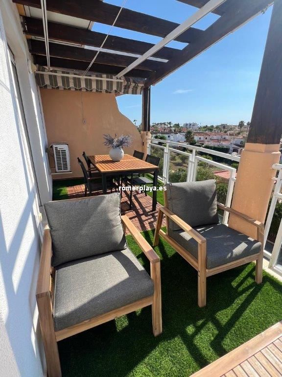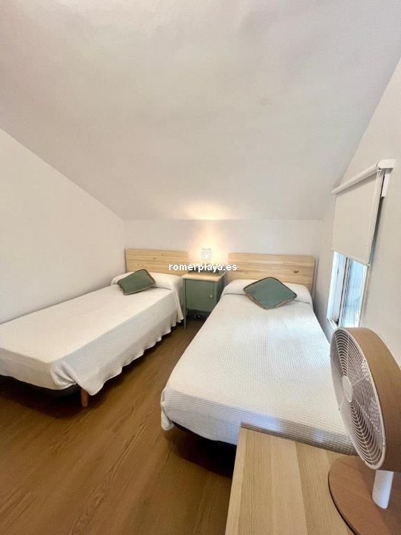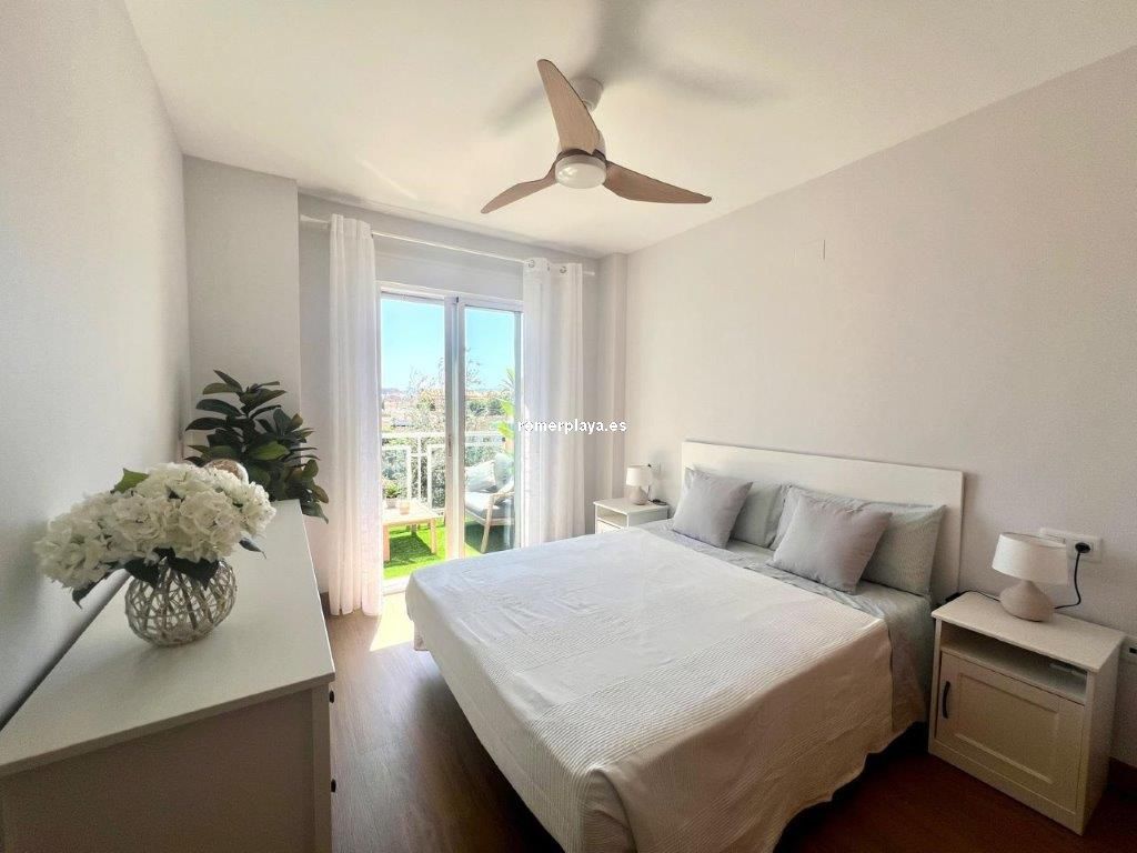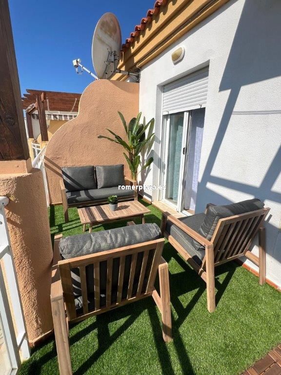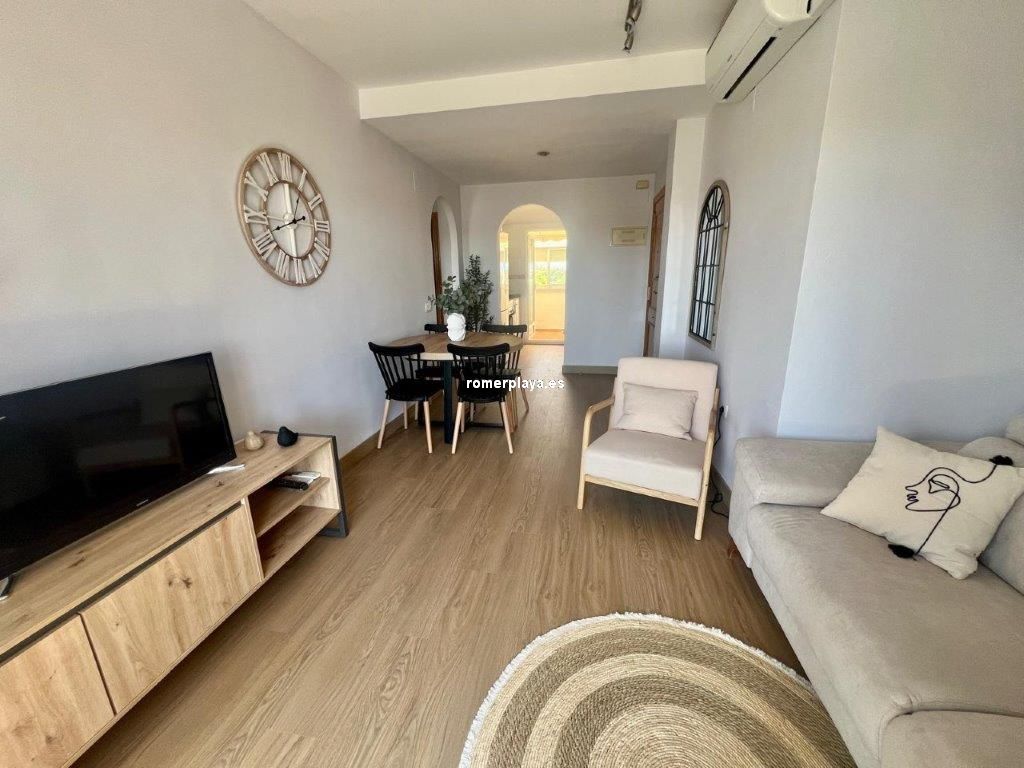 DISPONIBLE A PARTIR DE SEPTIEMBRE. IMPRESCINCIBLE SEGURO DE IMPAGO O AVAL BANCARIO Ático en km2 de las marinas a 500 metros de la playa, tiene orientación sol de mañana con lo que es muy agradable estar y disfrutar de las bonitas vistas al castillo y a la montaña, dispone de ascensor y tiene dos habitaciones, un baño completo , cocina independiente con galería acristalada, salón comedor con salida a la terraza bonita y espaciosa, soleado todo el año, hay una plaza de parking numerada y piscina con jardín comunitario.