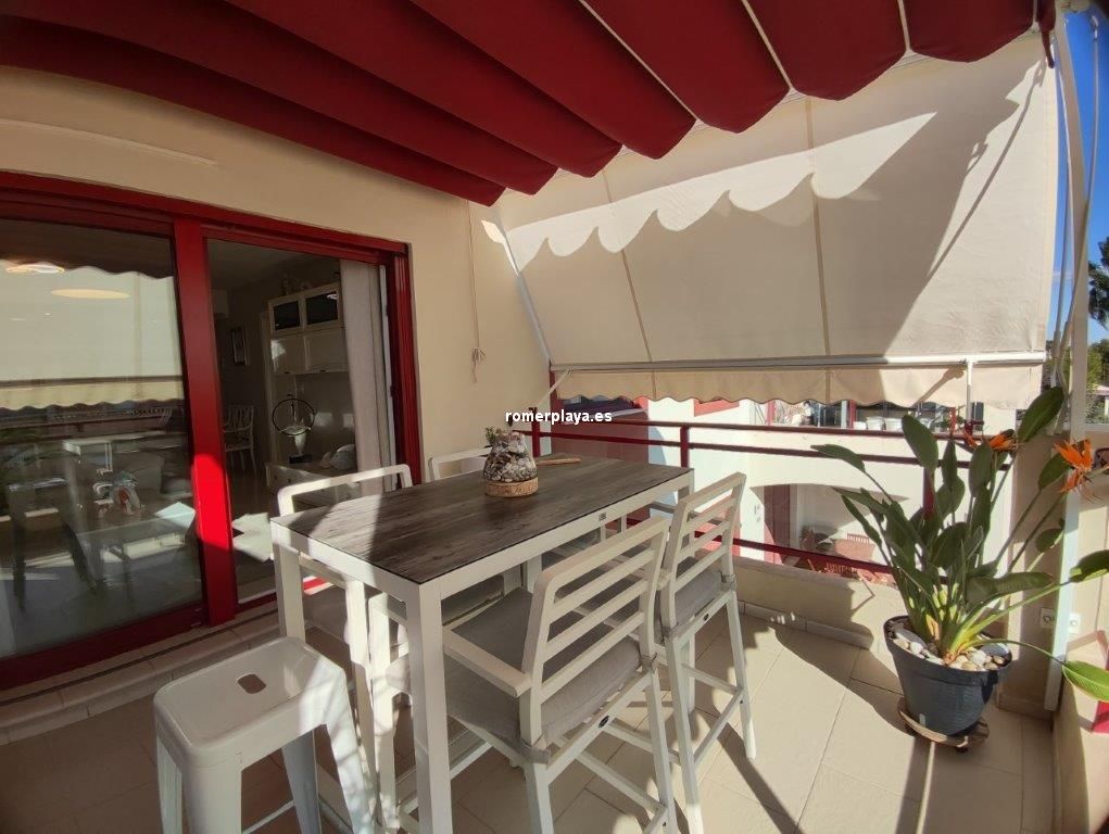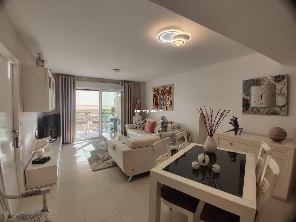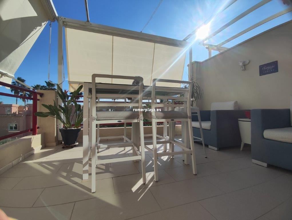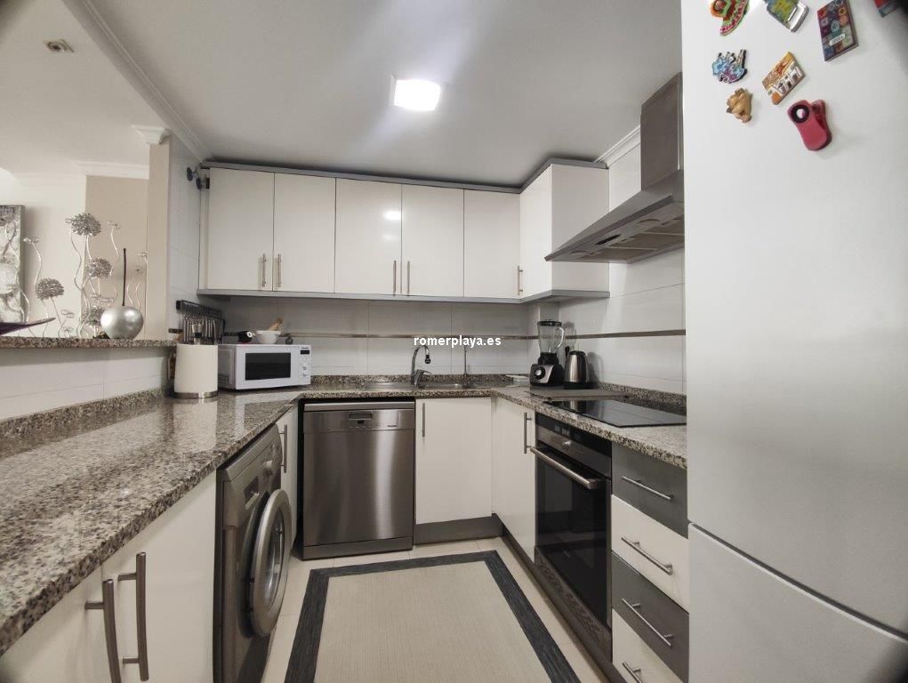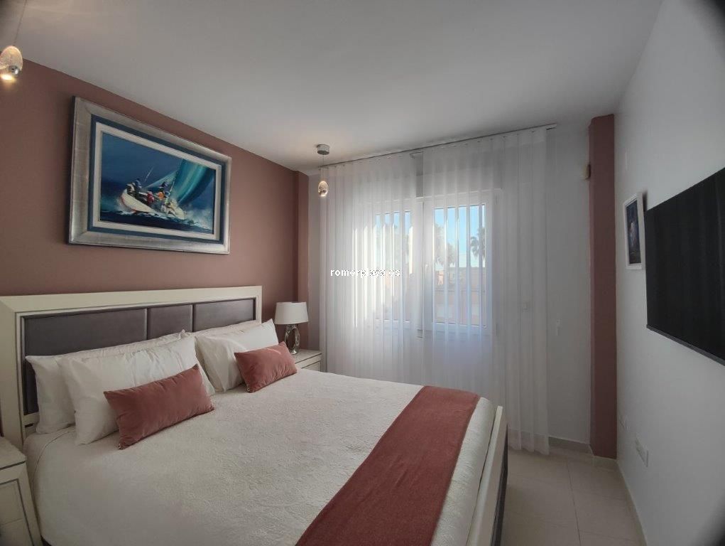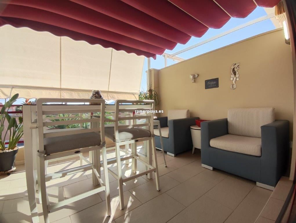 Apartamento en planta 2ª en urbanización con piscina y jardín, en el Km. 1.5 de Las Marinas, a 150m de la playa. La vivienda se distribuye en hall de entrada, 3 habitaciones dobles con armarios empotrados, 2 baños completos (uno en suite y otro con plato de ducha), cocina abierta equipada totalmente y salón comedor con salida a terraza de 13m con vistas abiertas. Dispone de plaza de parking techado numerado, aire acondicionado (f/c).