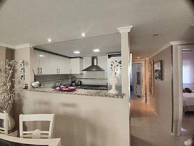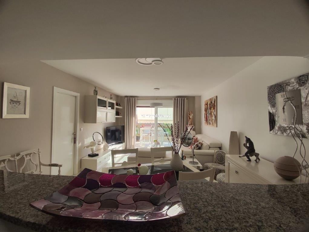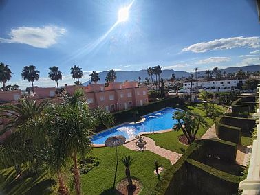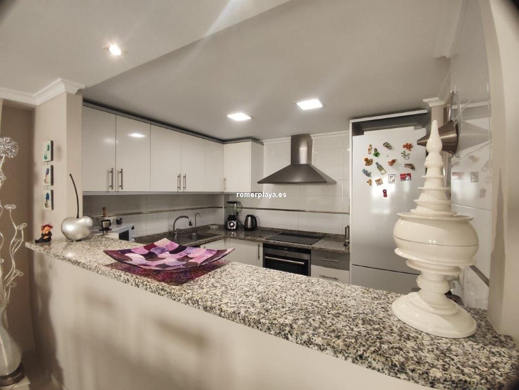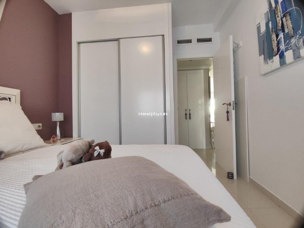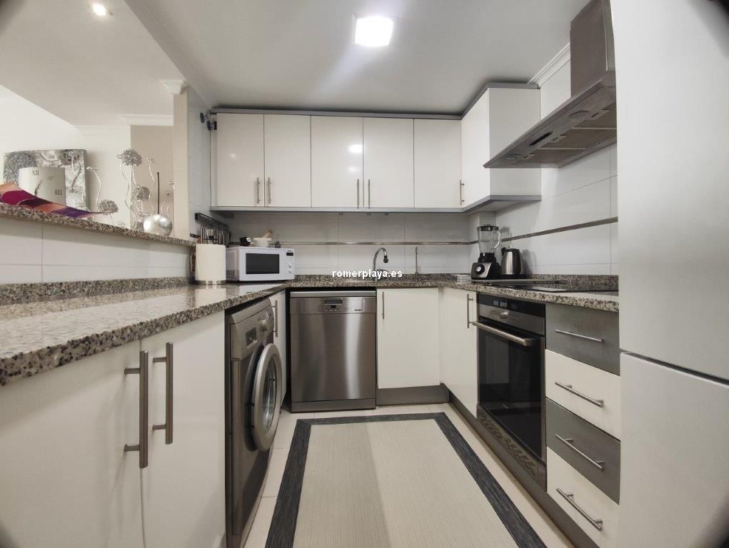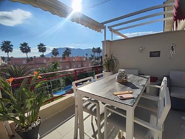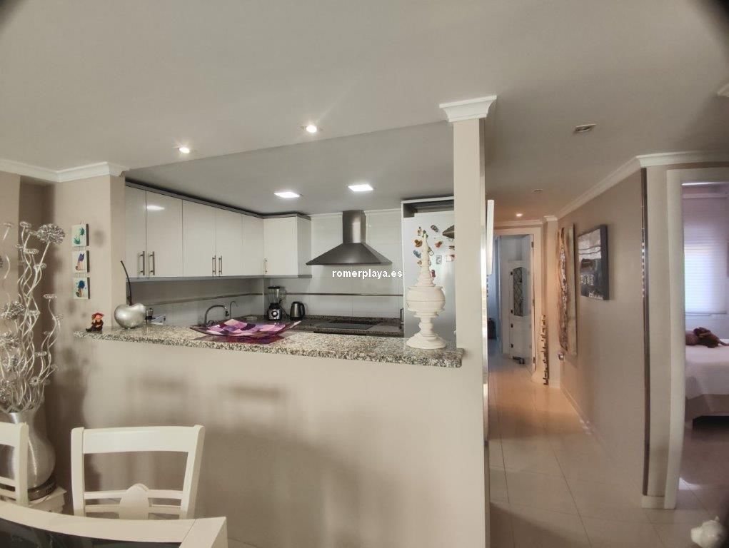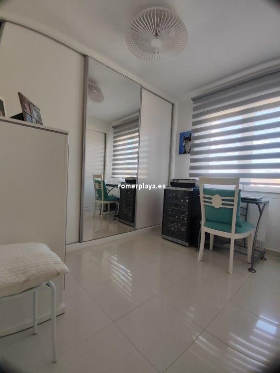 Apartamento en planta 2ª en urbanización con piscina y jardín, en el Km. 1.5 de Las Marinas, a 150m de la playa. La vivienda se distribuye en hall de entrada, 3 habitaciones dobles con armarios empotrados, 2 baños completos (uno en suite y otro con plato de ducha), cocina abierta equipada totalmente y salón comedor con salida a terraza de 13m con vistas abiertas. Dispone de plaza de parking techado numerado, aire acondicionado (f/c).