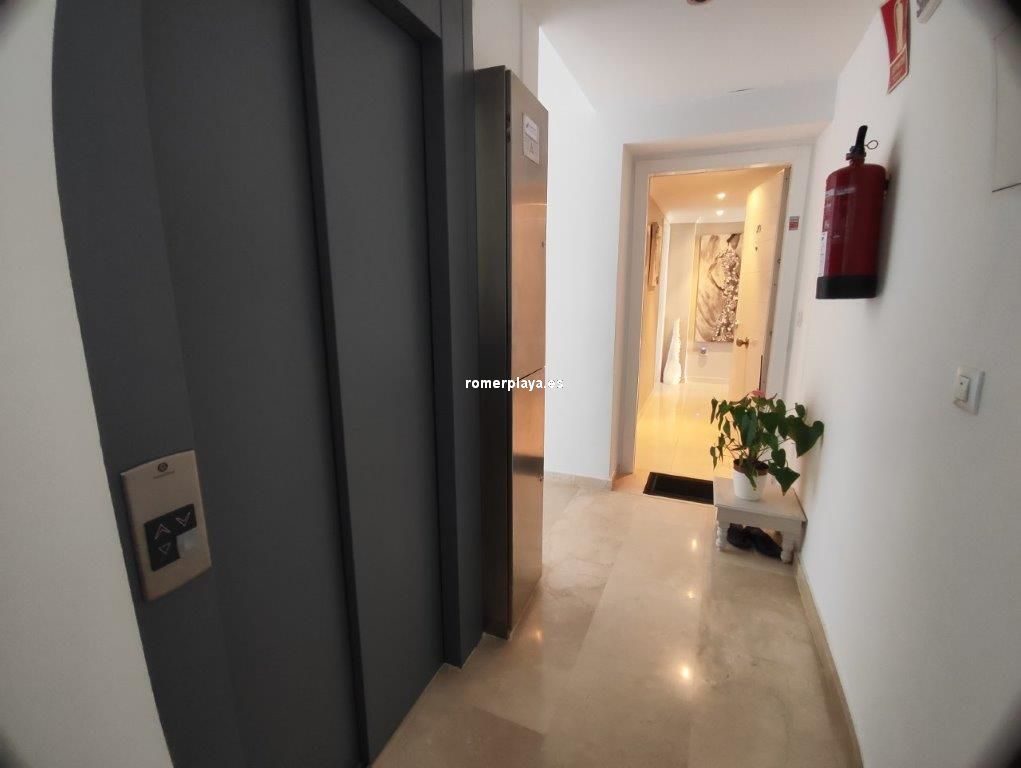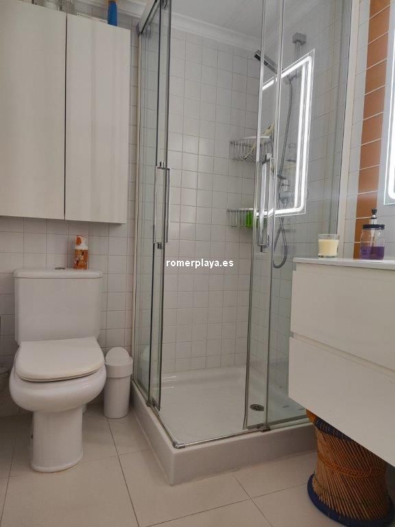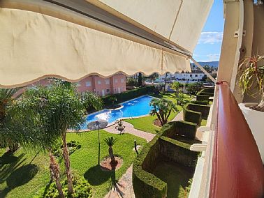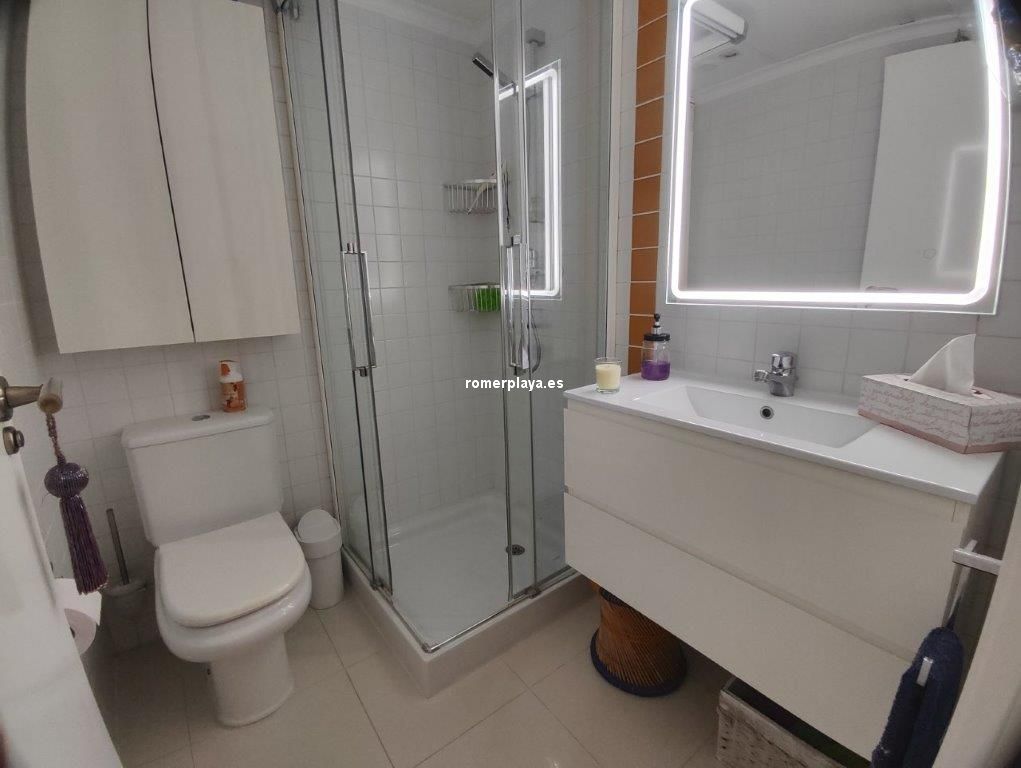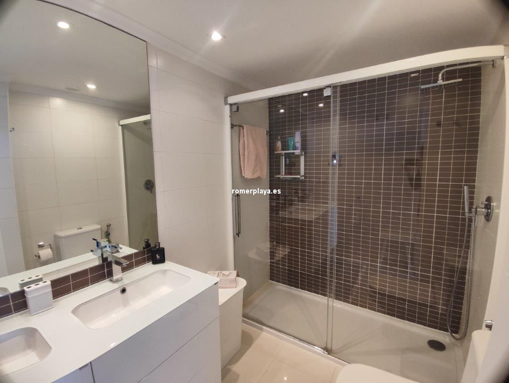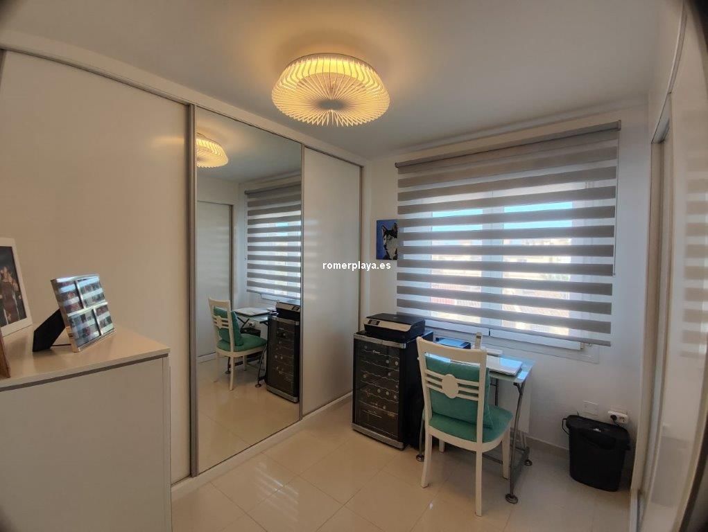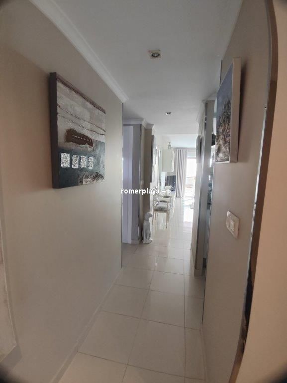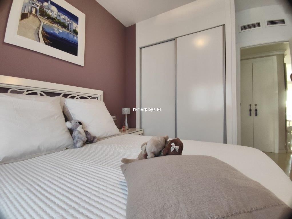 Apartamento en planta 2ª en urbanización con piscina y jardín, en el Km. 1.5 de Las Marinas, a 150m de la playa. La vivienda se distribuye en hall de entrada, 3 habitaciones dobles con armarios empotrados, 2 baños completos (uno en suite y otro con plato de ducha), cocina abierta equipada totalmente y salón comedor con salida a terraza de 13m con vistas abiertas. Dispone de plaza de parking techado numerado, aire acondicionado (f/c).