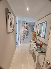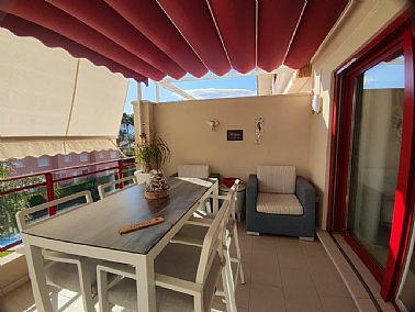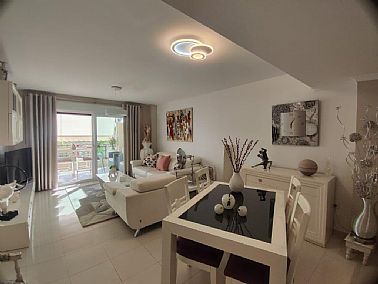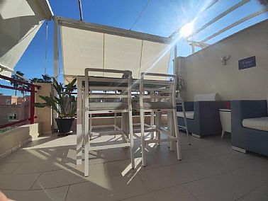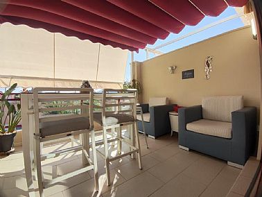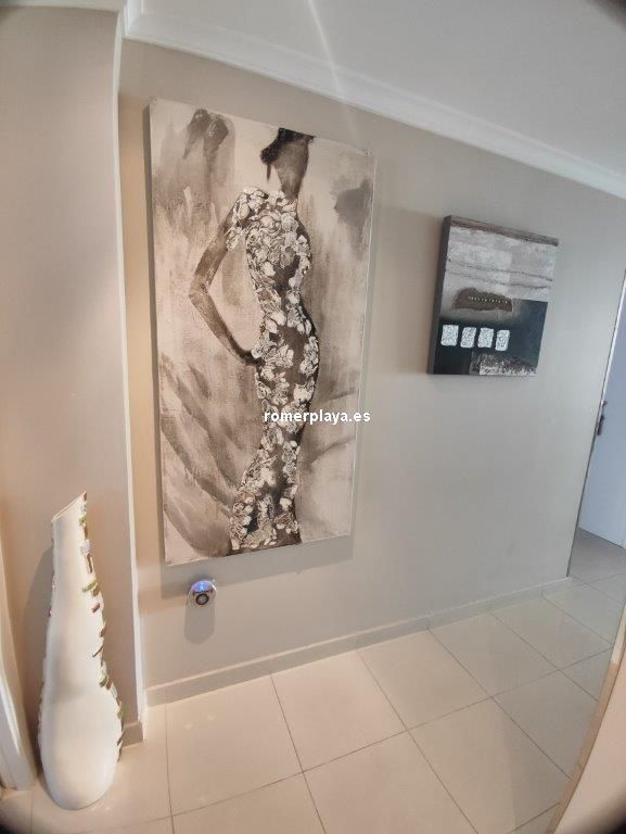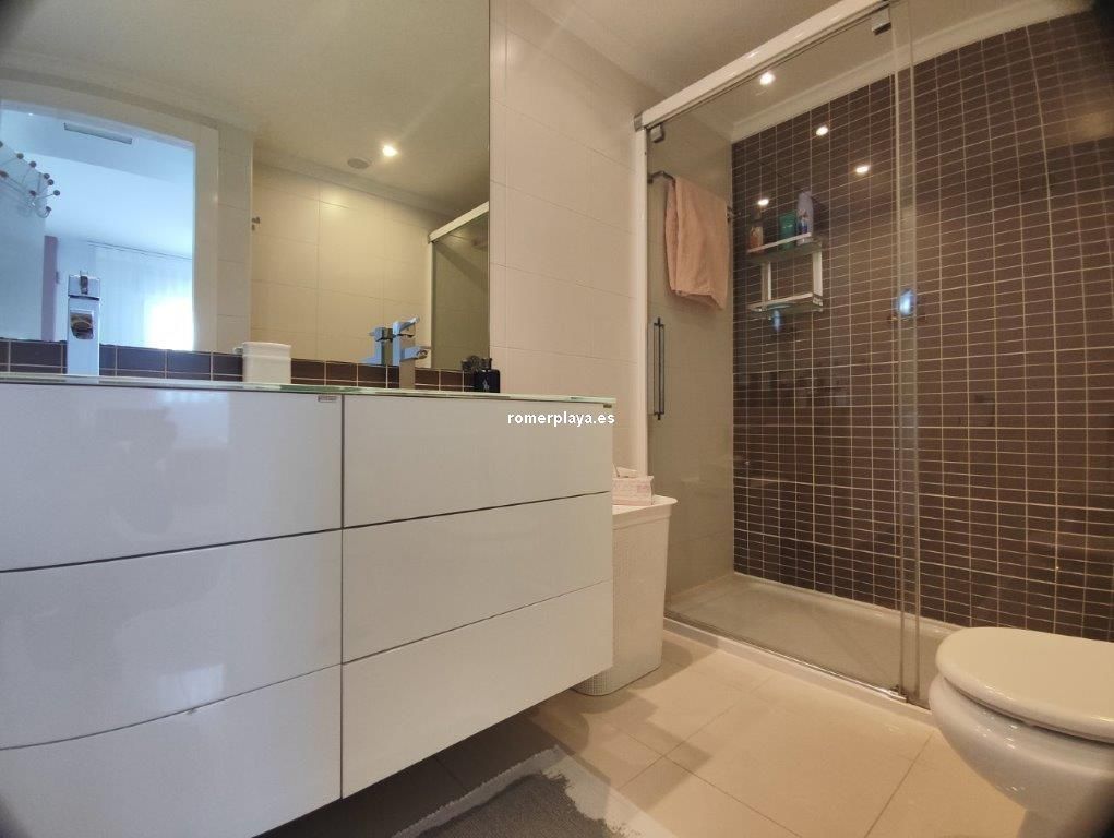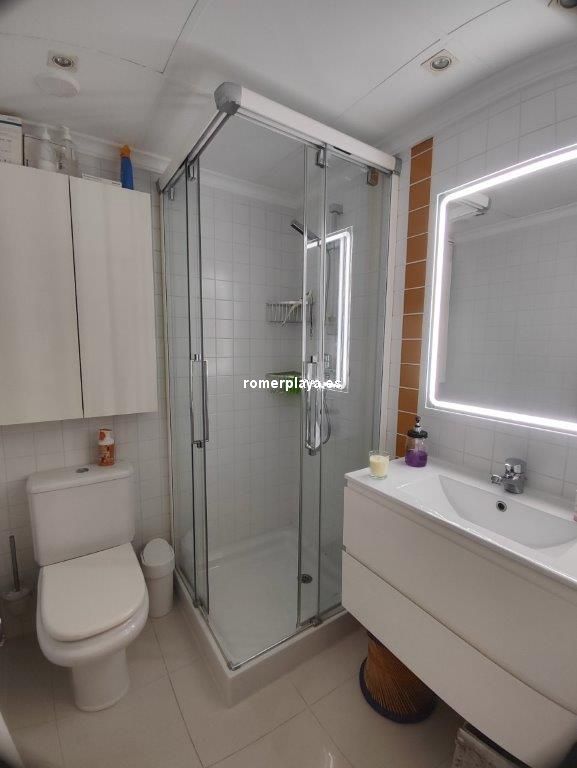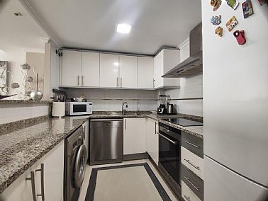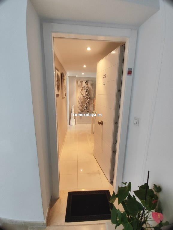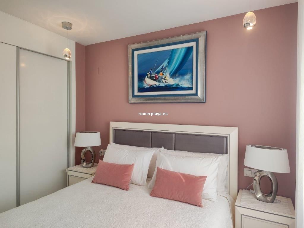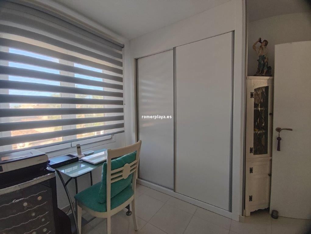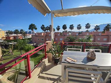 Apartamento en planta 2ª en urbanización con piscina y jardín, en el Km. 1.5 de Las Marinas, a 150m de la playa. La vivienda se distribuye en hall de entrada, 3 habitaciones dobles con armarios empotrados, 2 baños completos (uno en suite y otro con plato de ducha), cocina abierta equipada totalmente y salón comedor con salida a terraza de 13m con vistas abiertas. Dispone de plaza de parking techado numerado, aire acondicionado (f/c).