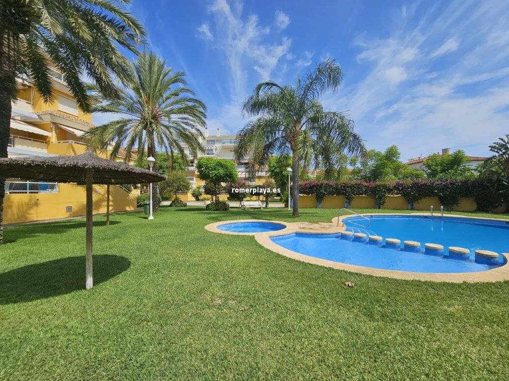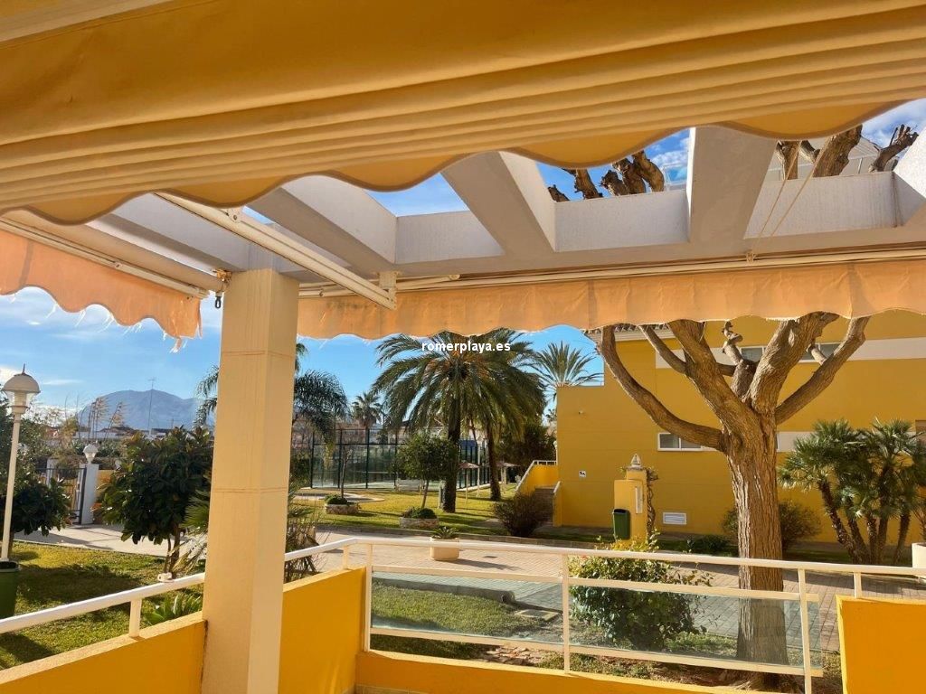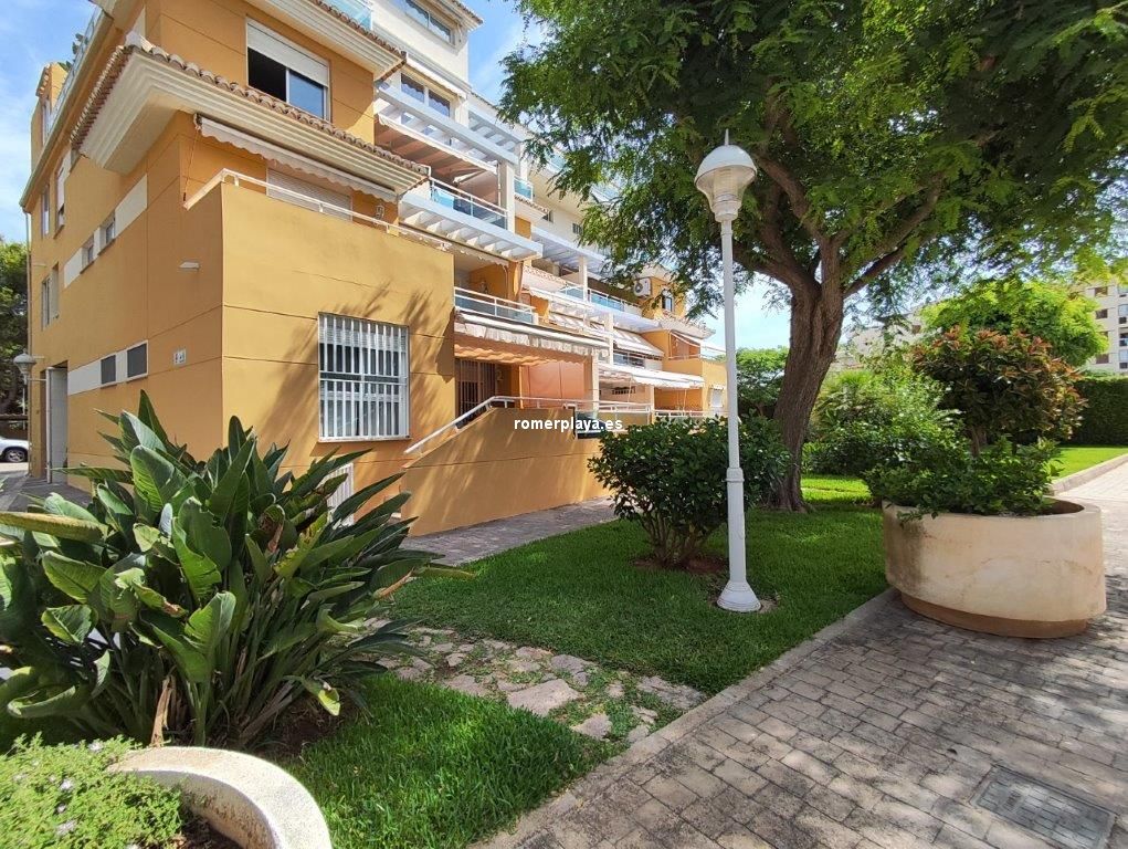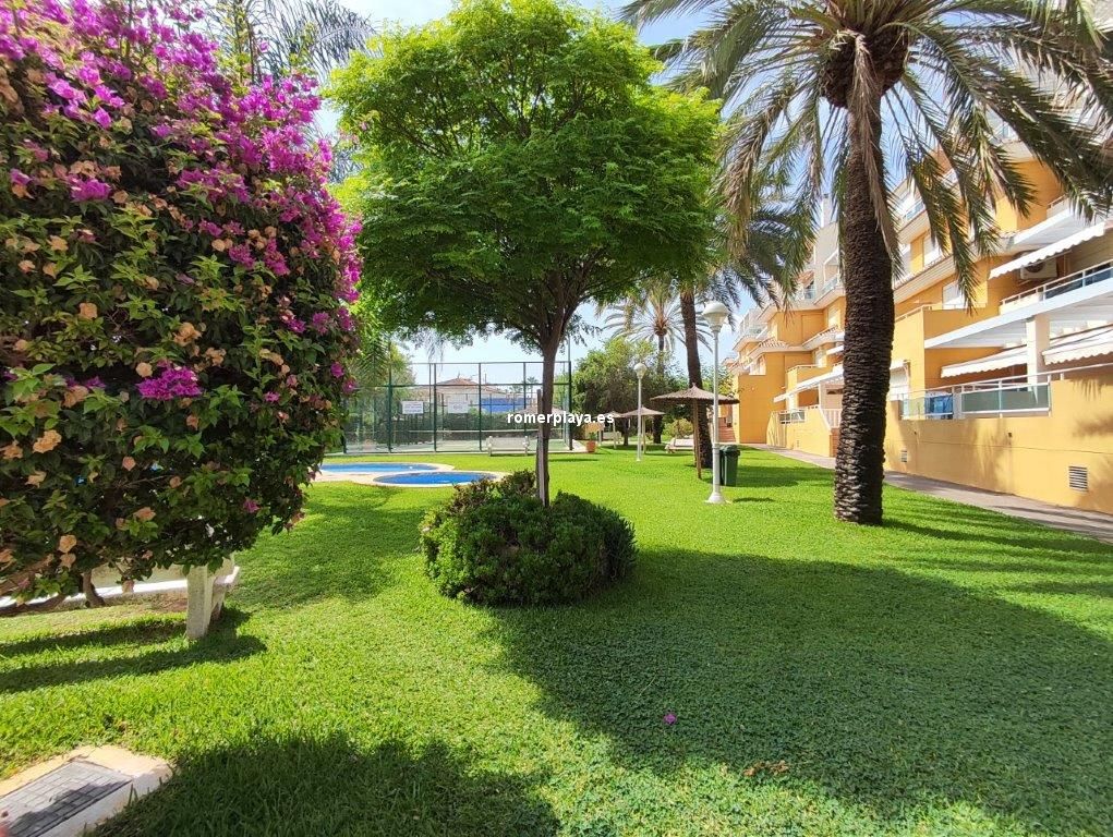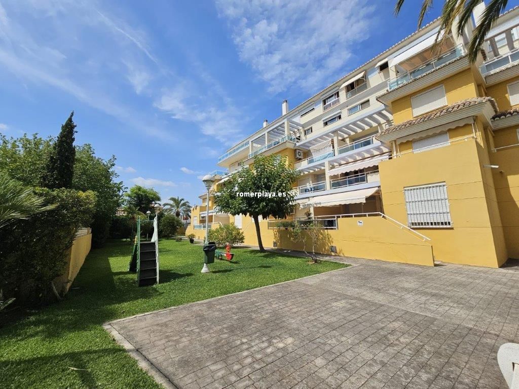 Bonita planta baja completamente exterior en 1º línea de playa en el Km 4,5 de las Marinas. Todo en una planta, 3 dormitorios dobles con armarios empotrados, dos baños con ventana, recién reformados, con plato de ducha, uno de ellos en suite en la habitación principal, salón comedor con cocina americana, totalmente equipada y recientemente reformada; y acceso desde el salón a una terraza muy privada de 25 metros con acceso desde la misma a las zonas comunes de la urbanización. La vivienda es muy luminosa, al ser una esquina dispone de total privacidad. La vivienda dispone de toldos en la terraza, aire acondicionado por conductos en toda la vivienda frío calor. Rejas. Una vivienda en esquina con entrada independiente, plaza de parking cubierta muy amplia en la misma puerta de la vivienda. En el residencial disponemos de unos jardines muy cuidados, piscina de adultos y niños, zona infantil y pista de paddel. Desde la propia urbanización a unos 100metros sin cruzar la carretera de las marinas nos encontramos una de las mejores zonas de playa de Arena de Denia. Además de tener todo tipo de servicios, restaurantes, supermercado, parada de autobús, cafeterías, bazar, y un pequeño centro de atención primaria en la zona en la época estival. No deje de verla!!