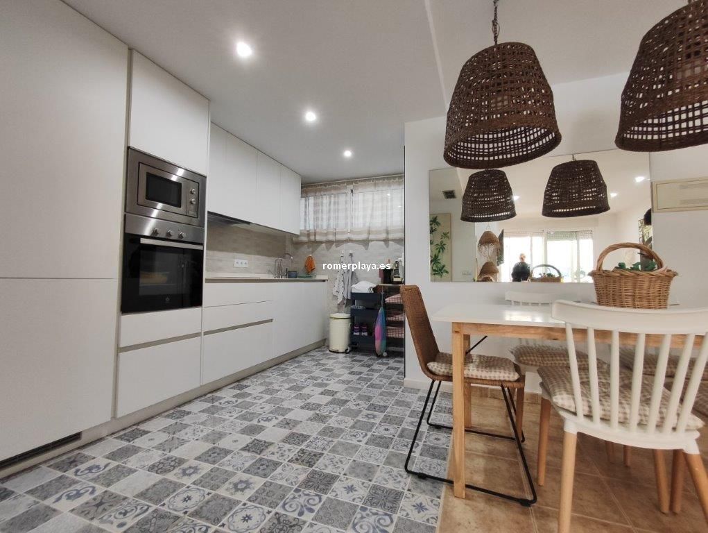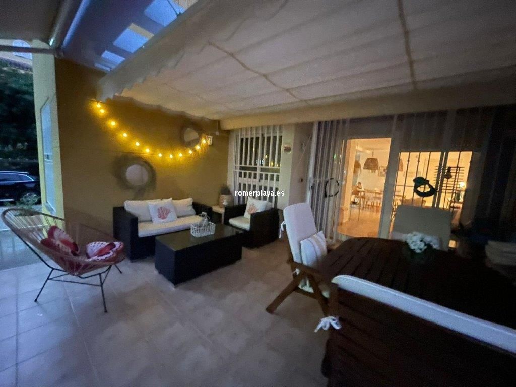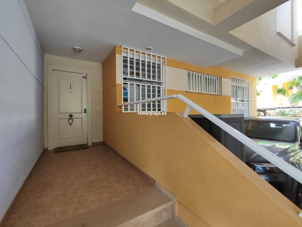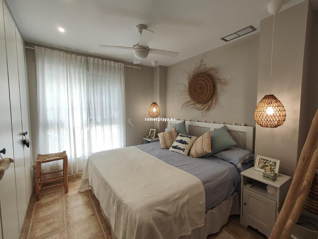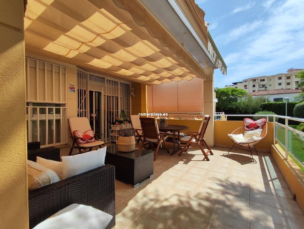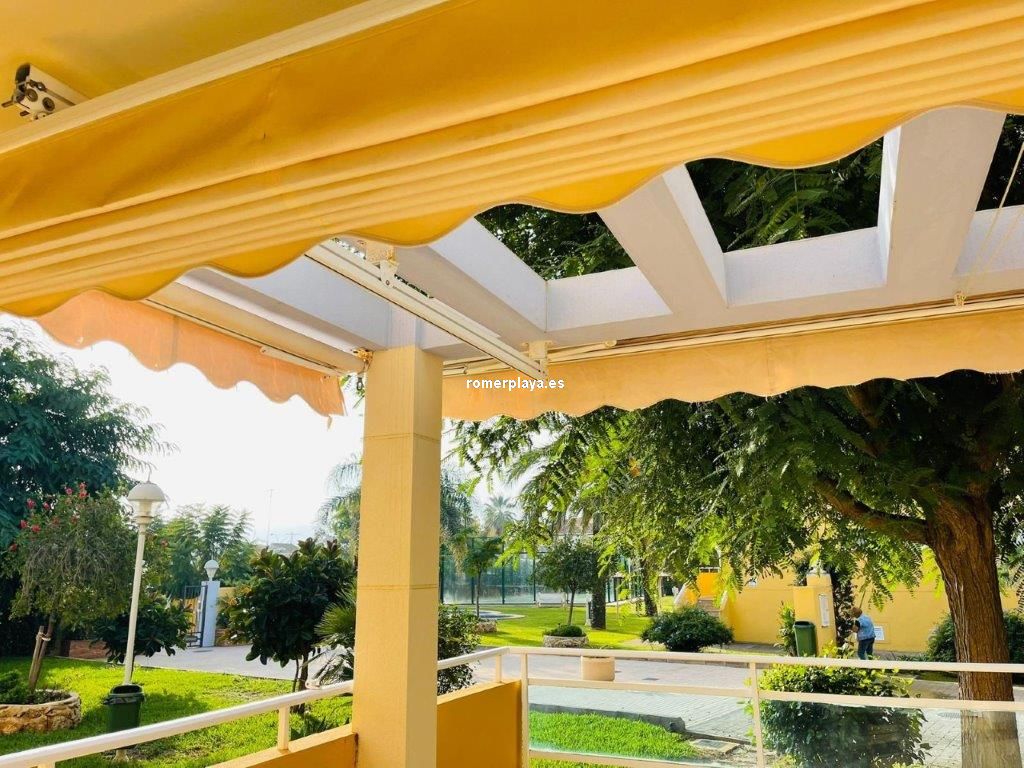 Bonita planta baja completamente exterior en 1º línea de playa en el Km 4,5 de las Marinas. Todo en una planta, 3 dormitorios dobles con armarios empotrados, dos baños con ventana, recién reformados, con plato de ducha, uno de ellos en suite en la habitación principal, salón comedor con cocina americana, totalmente equipada y recientemente reformada; y acceso desde el salón a una terraza muy privada de 25 metros con acceso desde la misma a las zonas comunes de la urbanización. La vivienda es muy luminosa, al ser una esquina dispone de total privacidad. La vivienda dispone de toldos en la terraza, aire acondicionado por conductos en toda la vivienda frío calor. Rejas. Una vivienda en esquina con entrada independiente, plaza de parking cubierta muy amplia en la misma puerta de la vivienda. En el residencial disponemos de unos jardines muy cuidados, piscina de adultos y niños, zona infantil y pista de paddel. Desde la propia urbanización a unos 100metros sin cruzar la carretera de las marinas nos encontramos una de las mejores zonas de playa de Arena de Denia. Además de tener todo tipo de servicios, restaurantes, supermercado, parada de autobús, cafeterías, bazar, y un pequeño centro de atención primaria en la zona en la época estival. No deje de verla!!
