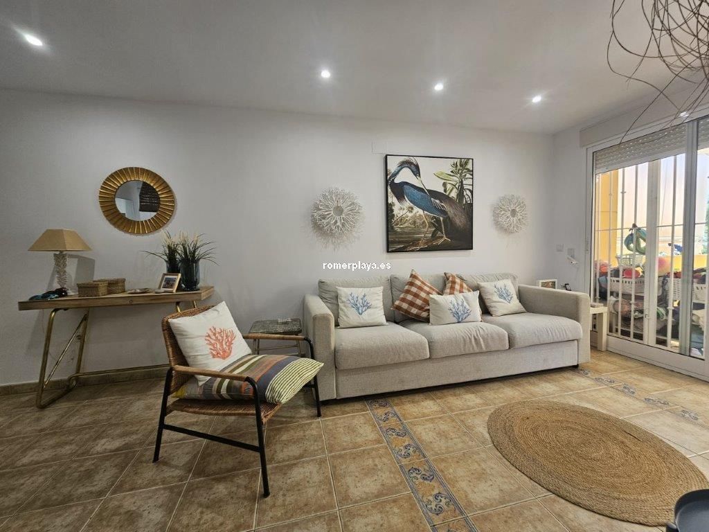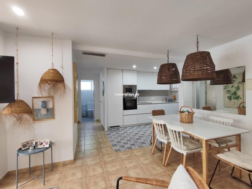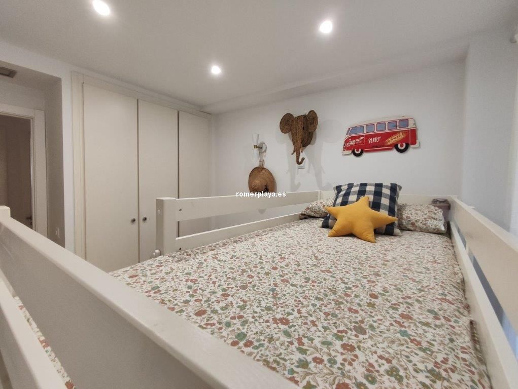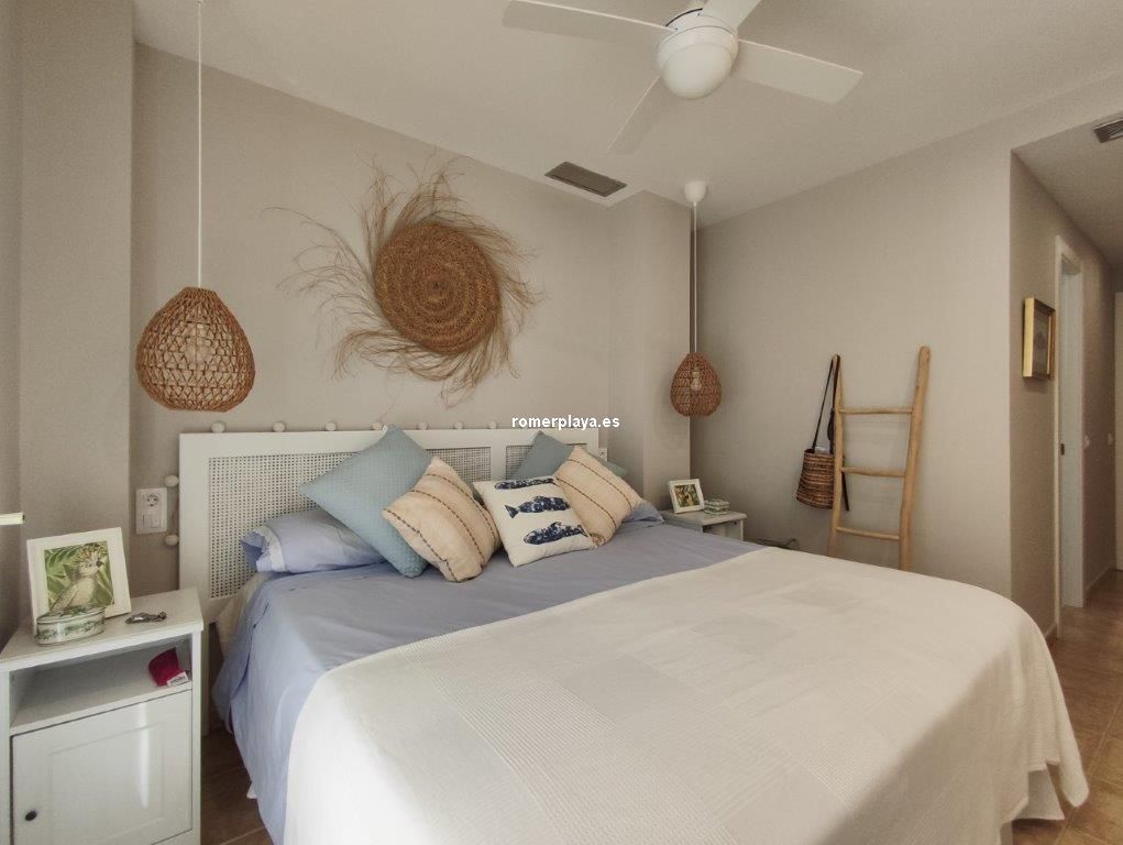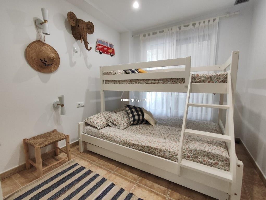 Bonita planta baja completamente exterior en 1º línea de playa en el Km 4,5 de las Marinas. Todo en una planta, 3 dormitorios dobles con armarios empotrados, dos baños con ventana, recién reformados, con plato de ducha, uno de ellos en suite en la habitación principal, salón comedor con cocina americana, totalmente equipada y recientemente reformada; y acceso desde el salón a una terraza muy privada de 25 metros con acceso desde la misma a las zonas comunes de la urbanización. La vivienda es muy luminosa, al ser una esquina dispone de total privacidad. La vivienda dispone de toldos en la terraza, aire acondicionado por conductos en toda la vivienda frío calor. Rejas. Una vivienda en esquina con entrada independiente, plaza de parking cubierta muy amplia en la misma puerta de la vivienda. En el residencial disponemos de unos jardines muy cuidados, piscina de adultos y niños, zona infantil y pista de paddel. Desde la propia urbanización a unos 100metros sin cruzar la carretera de las marinas nos encontramos una de las mejores zonas de playa de Arena de Denia. Además de tener todo tipo de servicios, restaurantes, supermercado, parada de autobús, cafeterías, bazar, y un pequeño centro de atención primaria en la zona en la época estival. No deje de verla!!
