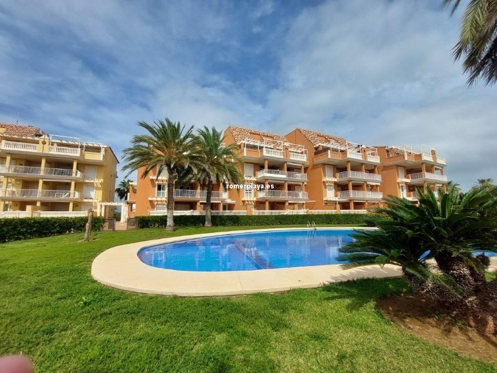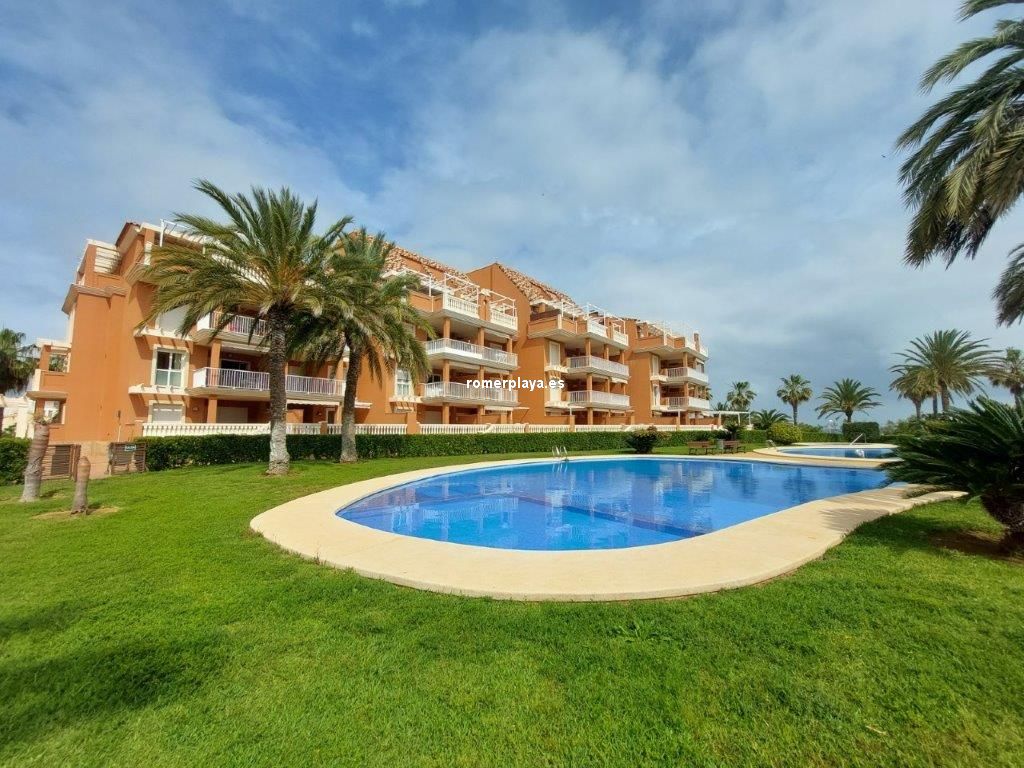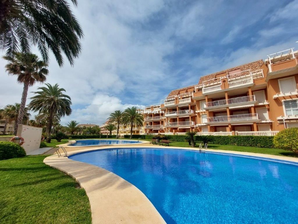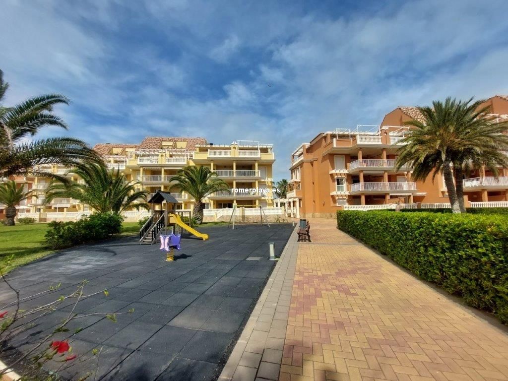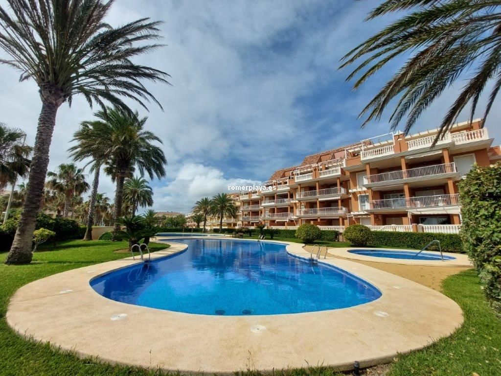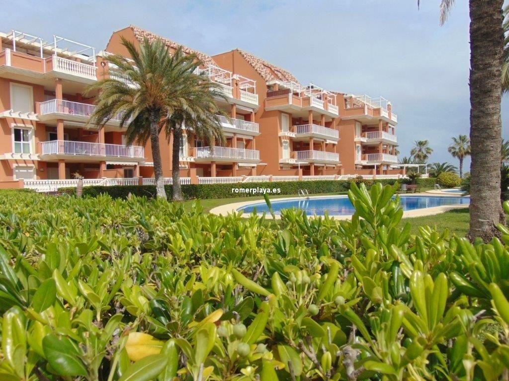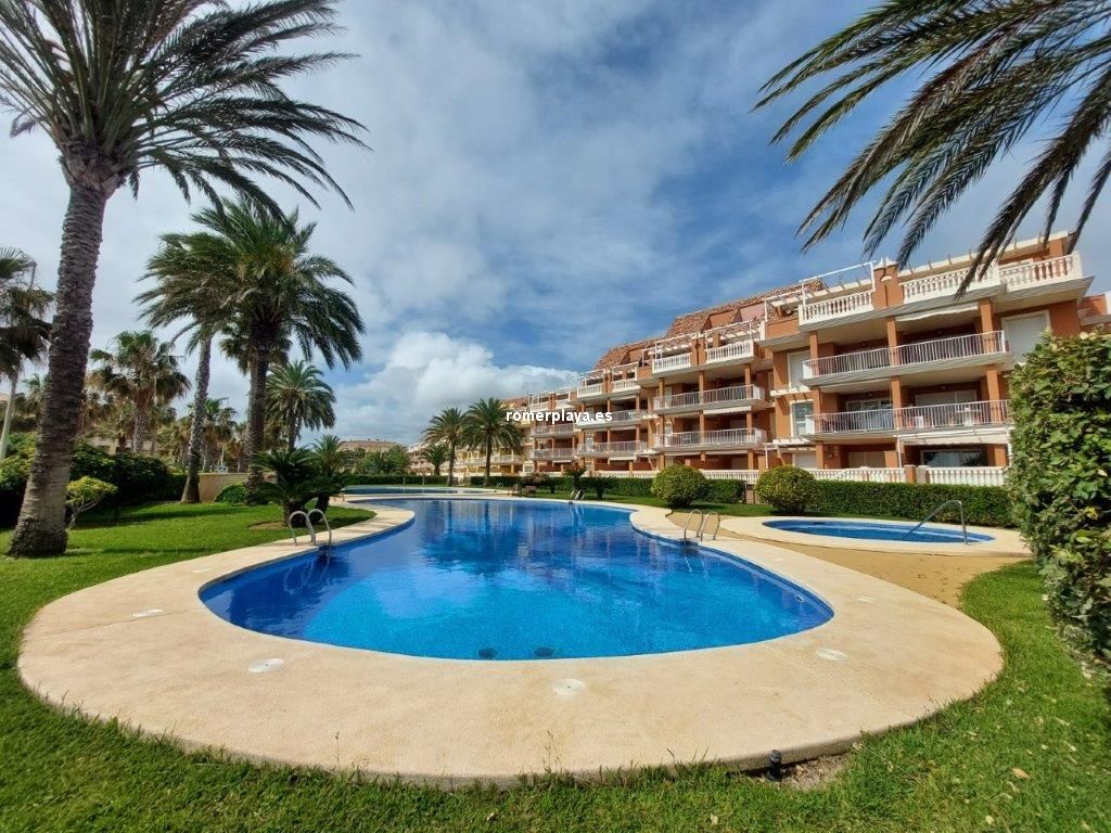 Este luminoso apartamento se encuentra en una exclusiva urbanización en primera línea de la playa, con acceso directo al mar y una ubicación excepcional junto a la parada de autobús, supermercados y una amplia oferta de restaurantes. La urbanización ofrece excelentes servicios: piscina comunitaria, pista de pádel, amplias zonas verdes y conserje durante todo el año. La vivienda cuenta con 60 m² interiores distribuidos en dos dormitorios y dos baños completos, así como dos terrazas que aportan una calidad de vida inmejorable: Terraza principal de 20 m² con salida directa al jardín de la urbanización, ideal para disfrutar del clima mediterráneo. Segunda terraza de 15 m², orientada al oeste, que ofrece sol de tarde y acceso desde la cocina y el segundo dormitorio. Entre sus calidades destacan el suelo de mármol, aire acondicionado, persianas eléctricas y excelente estado de conservación. El precio incluye un garaje subterráneo y un trastero, un valor añadido imprescindible en esta zona. Una propiedad perfecta tanto para vacaciones como para vivir todo el año, en una de las mejores zonas de Dénia y a solo unos pasos del mar