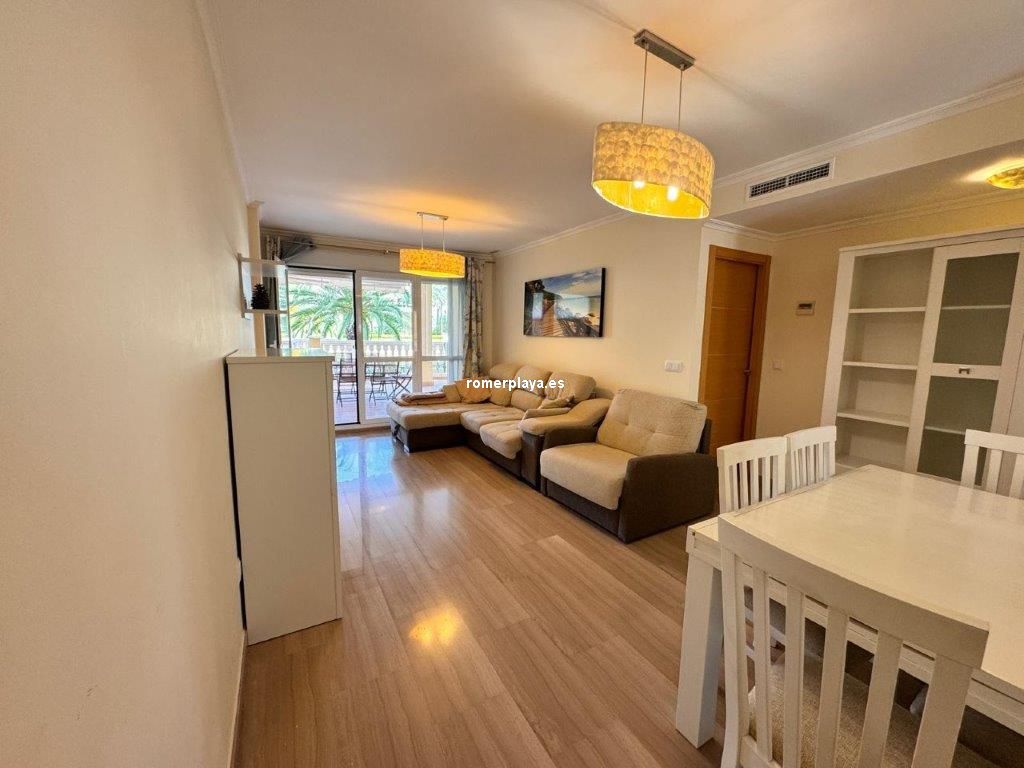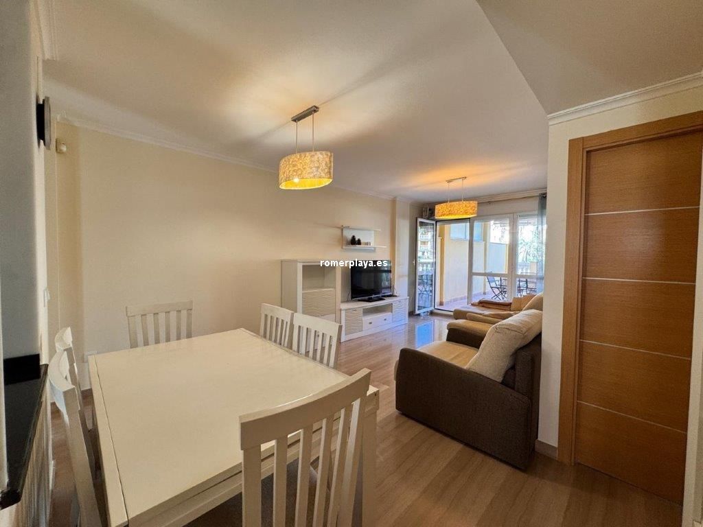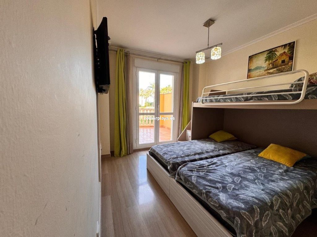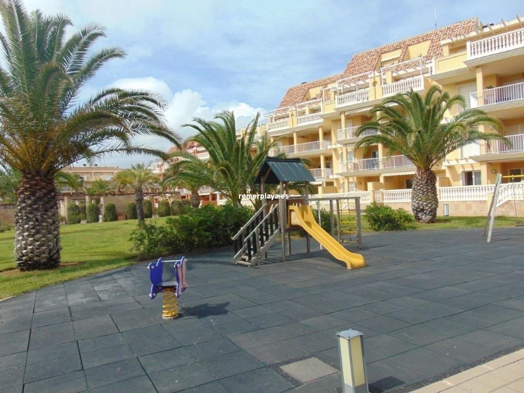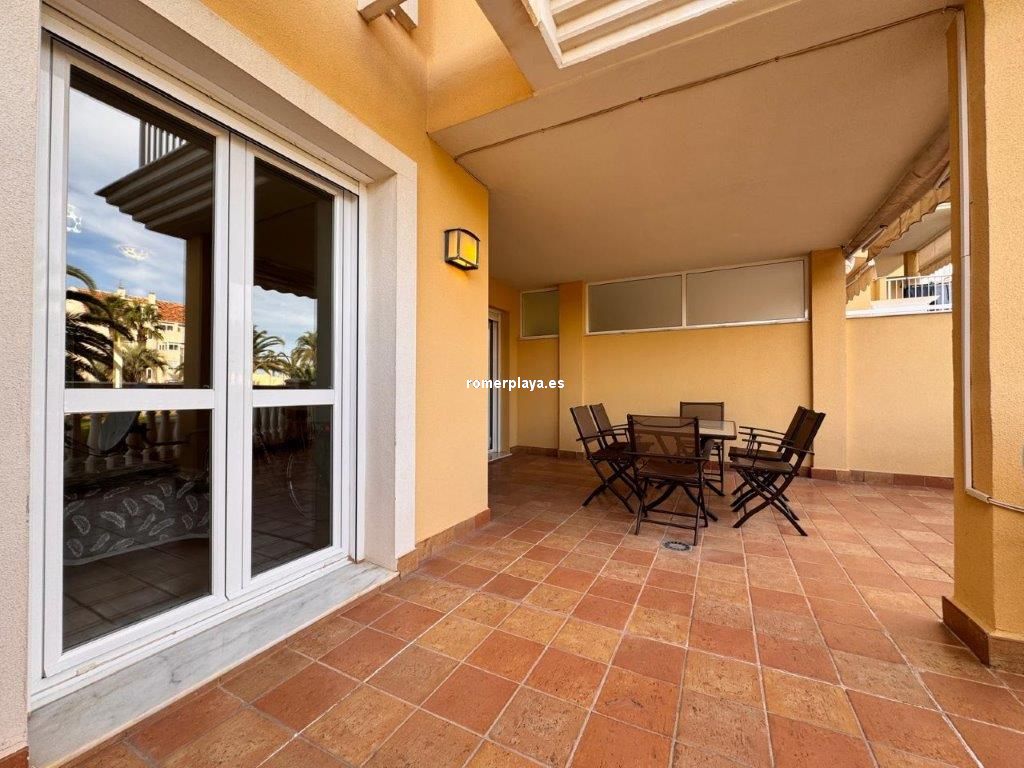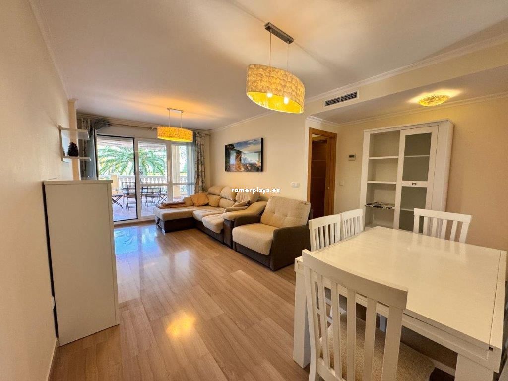 Este luminoso apartamento se encuentra en una exclusiva urbanización en primera línea de la playa, con acceso directo al mar y una ubicación excepcional junto a la parada de autobús, supermercados y una amplia oferta de restaurantes. La urbanización ofrece excelentes servicios: piscina comunitaria, pista de pádel, amplias zonas verdes y conserje durante todo el año. La vivienda cuenta con 60 m² interiores distribuidos en dos dormitorios y dos baños completos, así como dos terrazas que aportan una calidad de vida inmejorable: Terraza principal de 20 m² con salida directa al jardín de la urbanización, ideal para disfrutar del clima mediterráneo. Segunda terraza de 15 m², orientada al oeste, que ofrece sol de tarde y acceso desde la cocina y el segundo dormitorio. Entre sus calidades destacan el suelo de mármol, aire acondicionado, persianas eléctricas y excelente estado de conservación. El precio incluye un garaje subterráneo y un trastero, un valor añadido imprescindible en esta zona. Una propiedad perfecta tanto para vacaciones como para vivir todo el año, en una de las mejores zonas de Dénia y a solo unos pasos del mar