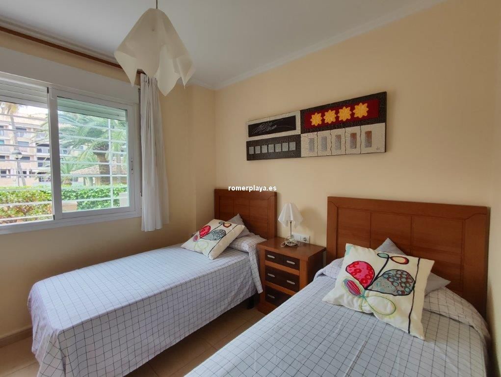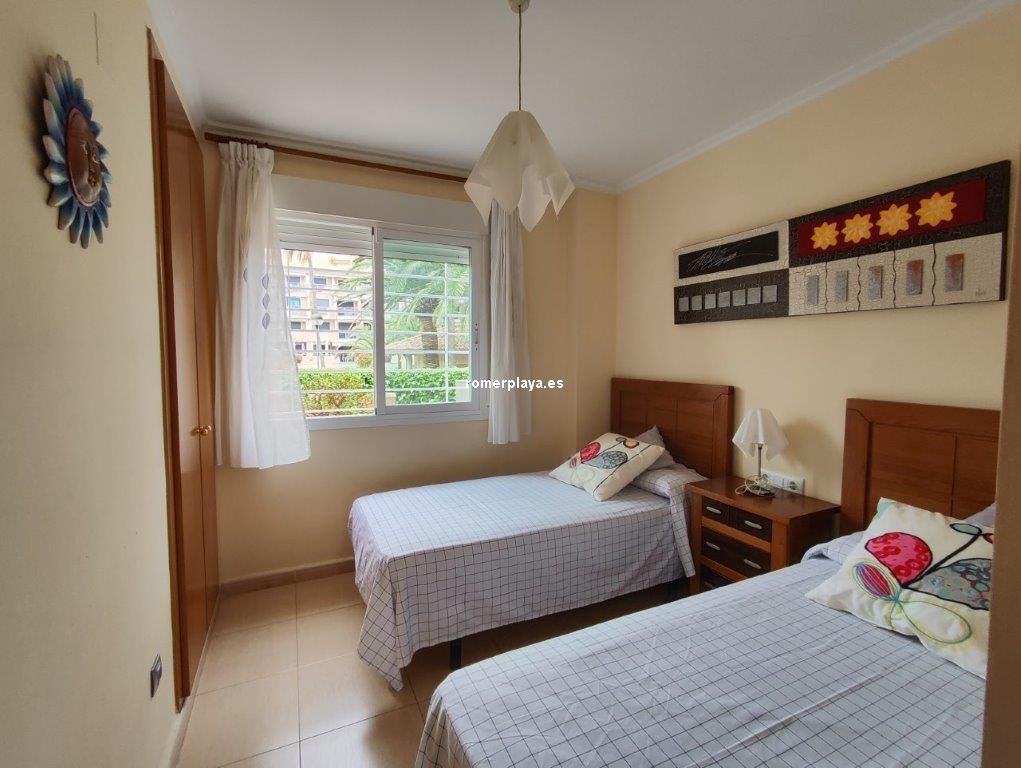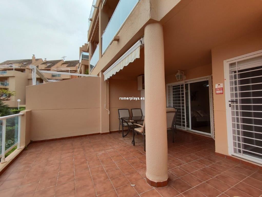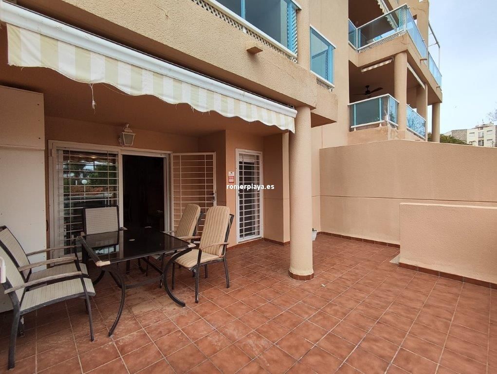 Bonita vivienda en planta baja, con amplia terraza de unos 25 metros y jardín privado de 25 metros, con acceso directo a las piscinas y jardines comunes. Urbanización magníficamente ubicada en la carretera de las Marinas, zona del Hotel los Ángeles, con todo tipo de servicios en la misma zona, y una fantástica playa de arena fina y blanca con aguas cristalinas. La vivienda interiormente se distribuye en hall de entrada, cocina independiente completamente equipada y galería, un gran salón comedir con acceso a la terraza con sol de mañana , y con toldos, además dispone de dos dormitorios y dos cuartos de baño, uno de ellos en la habitación principal en suite. La vivienda dispone de aire acondicionado frio calor, dos plazas de aparcamiento, una subterránea y otra en superficie, y un trastero. En el Km 4 de las Marinas, a 150m de la playa. Y con parada de bus en la puerta.