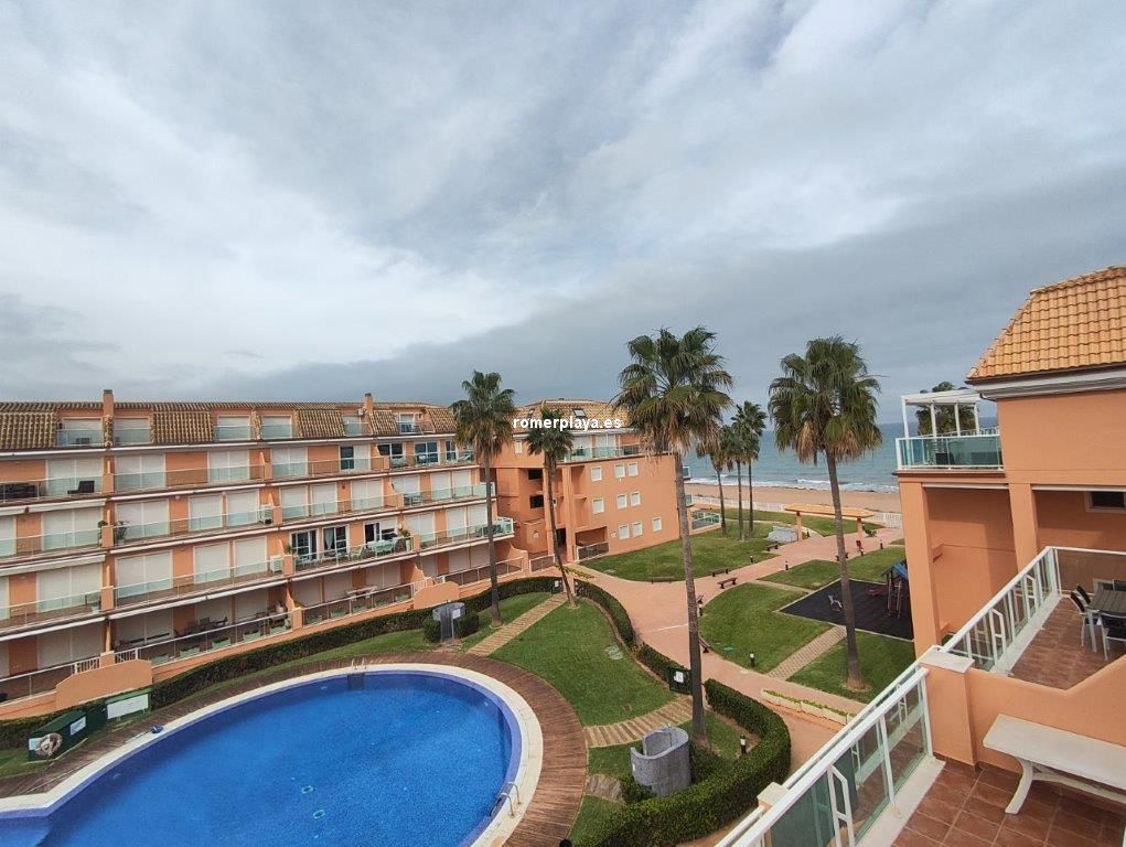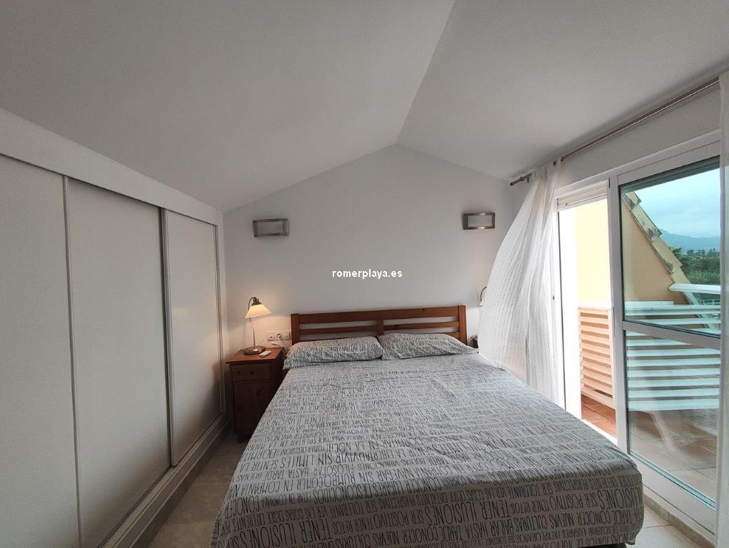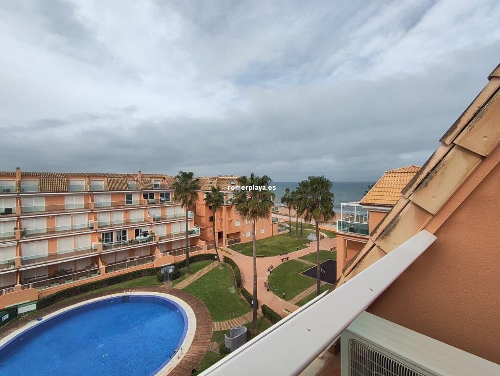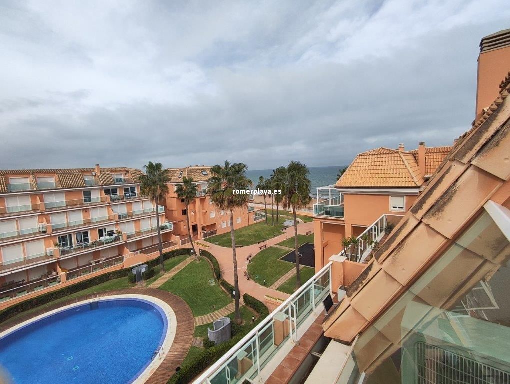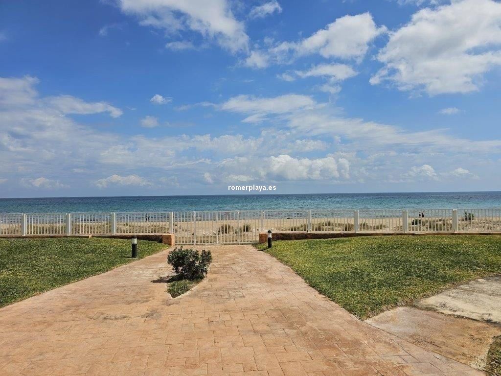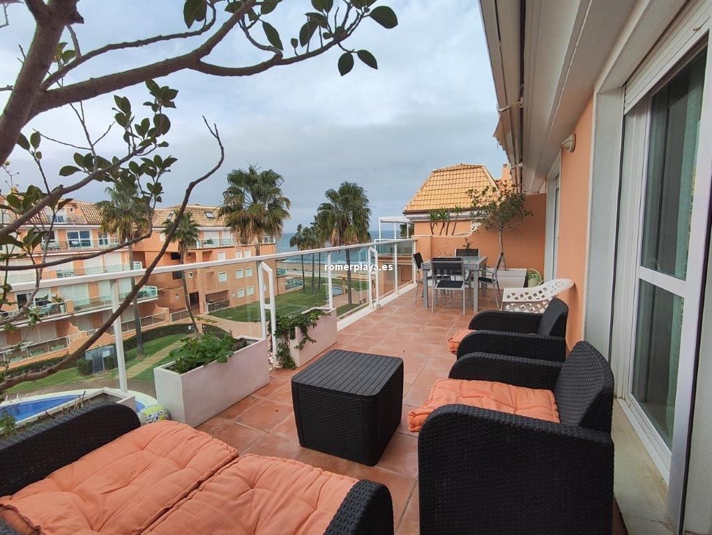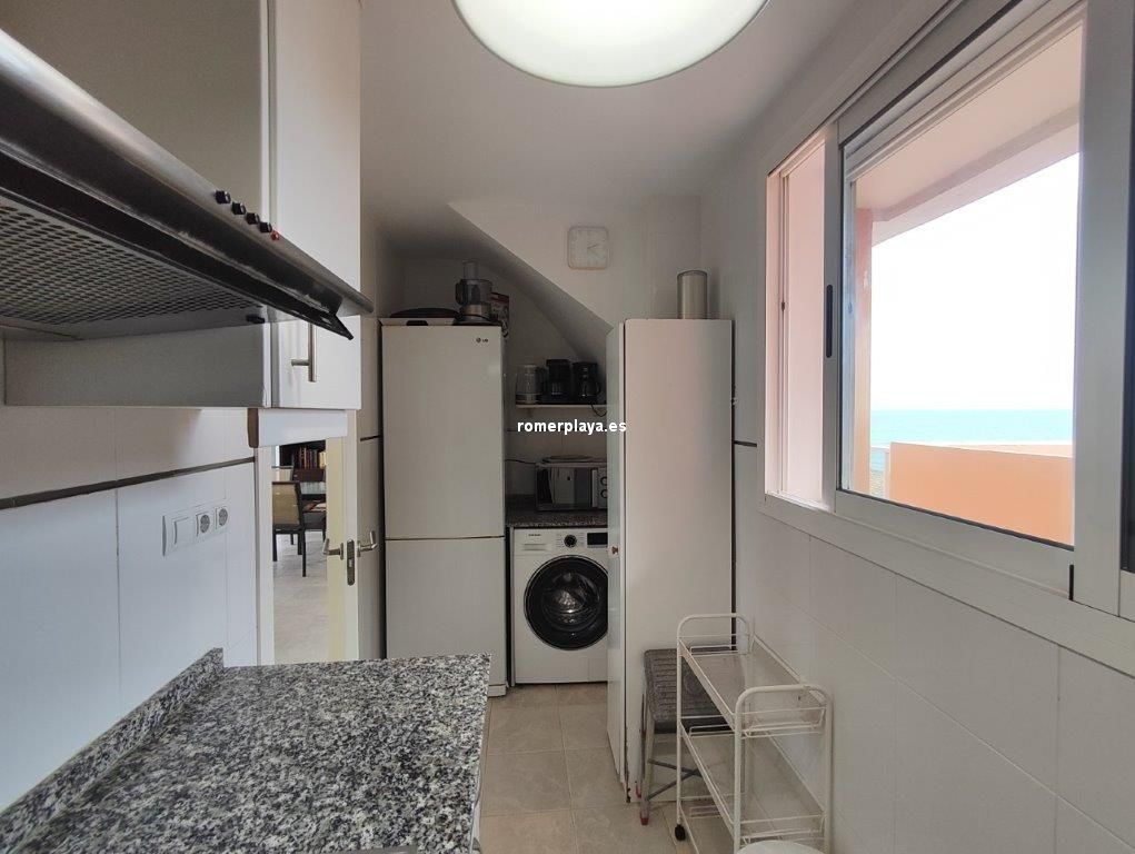 Ático- dúplex con fantásticas vistas al mar, en primera línea de playa, ubicado en el km 7,5 de las marinas con salida directa desde el complejo a la playa de arena fina y aguas cristalinas. La vivienda en 3ª planta y bajo cubierta, en la planta principal disponemos de un amplio salón comedor, desde al que se accede a una imponente terraza con toldos de unos 25 metros cuadrados, cocina independiente completamente equipada, aseo con plato de ducha y una habitación sencilla con literas . Por unas escaleras de marmol muy cómodas accedemos a la planta superior donde disponemos de dos amplios dormitorios dobles con armarios empotrados y dos terrazas, además de un espacioso cuarto de baño con bañera. Toda la vivienda dispone de Aire acondicionado frio calor, unas maravillosas vistas al mar y a la montaña. El residencial dispone de unas bonitas y cuidadas zonas comunes, donde hay una gran piscina con diferentes profundidades, zona infantil, pista de paddel. La vivienda dispone de una plaza de garaje subterránea de 15 metros y trastero de 10 metros cuadrados. Se accede directamente por el ascensor desde la planta de la vivienda al sótano. Este ático está en una zona muy valorada de las marinas, cerca de supermercados, restaurantes y parada de autobús. No deje de verlo.