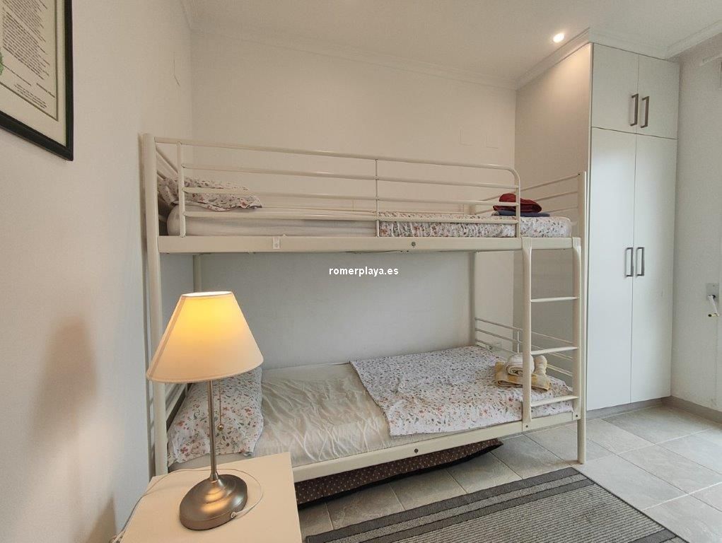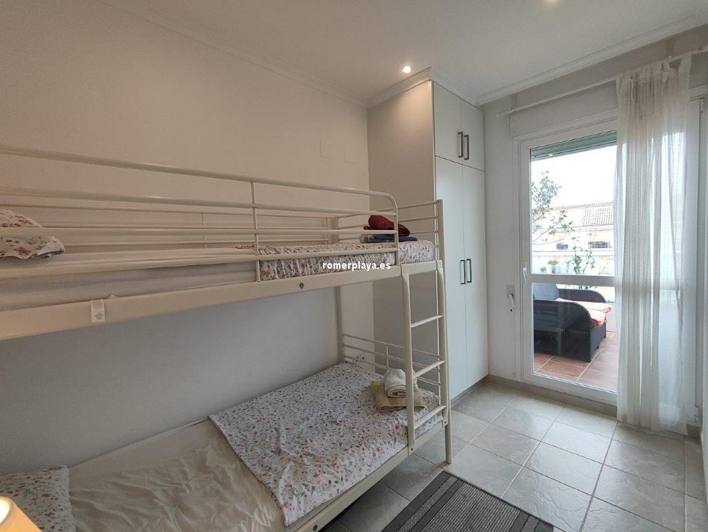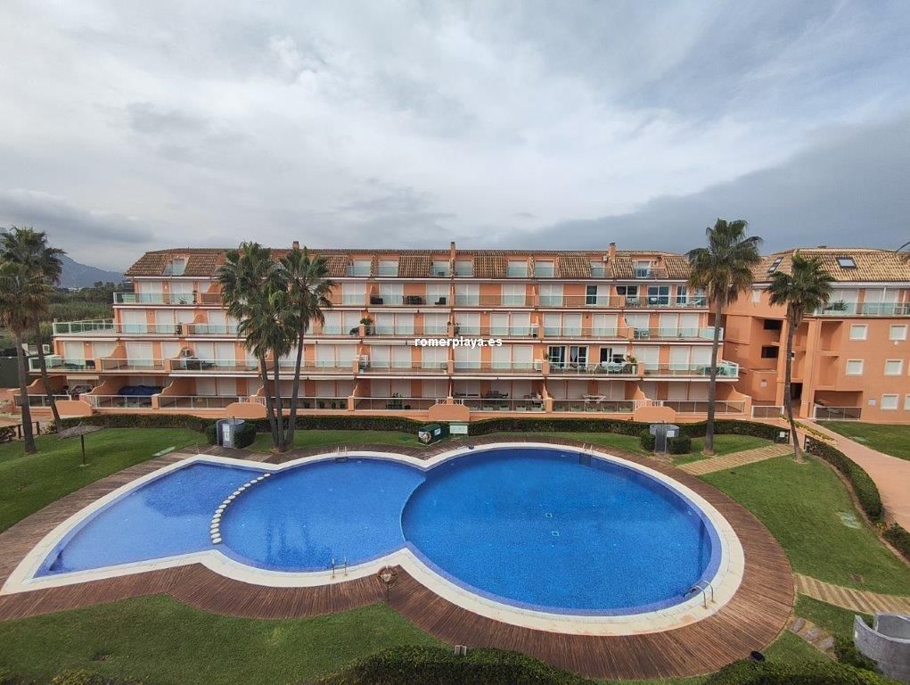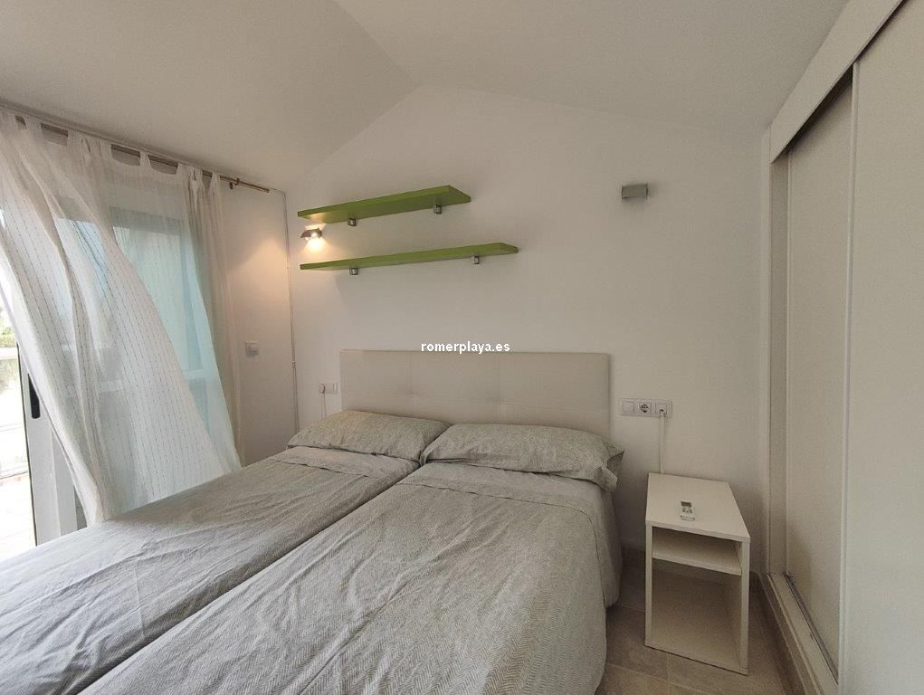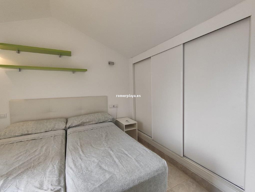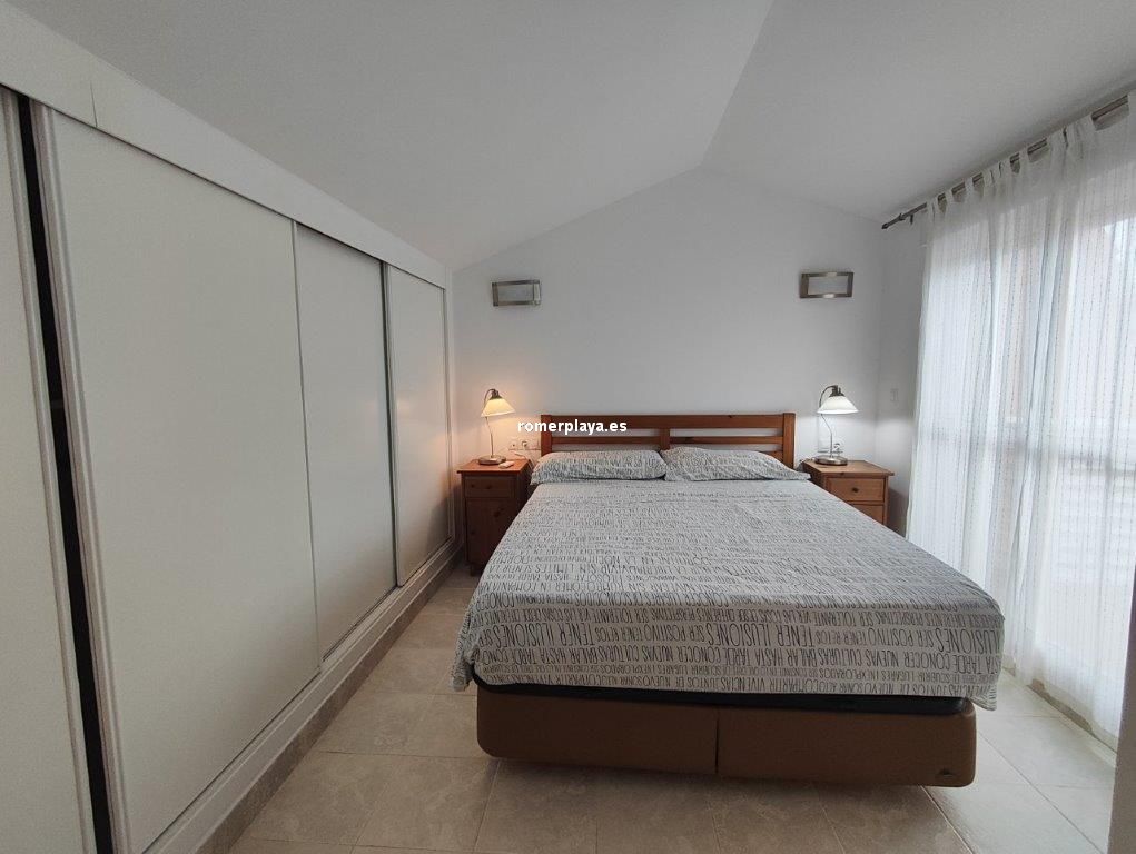 Ático- dúplex con fantásticas vistas al mar, en primera línea de playa, ubicado en el km 7,5 de las marinas con salida directa desde el complejo a la playa de arena fina y aguas cristalinas. La vivienda en 3ª planta y bajo cubierta, en la planta principal disponemos de un amplio salón comedor, desde al que se accede a una imponente terraza con toldos de unos 25 metros cuadrados, cocina independiente completamente equipada, aseo con plato de ducha y una habitación sencilla con literas . Por unas escaleras de marmol muy cómodas accedemos a la planta superior donde disponemos de dos amplios dormitorios dobles con armarios empotrados y dos terrazas, además de un espacioso cuarto de baño con bañera. Toda la vivienda dispone de Aire acondicionado frio calor, unas maravillosas vistas al mar y a la montaña. El residencial dispone de unas bonitas y cuidadas zonas comunes, donde hay una gran piscina con diferentes profundidades, zona infantil, pista de paddel. La vivienda dispone de una plaza de garaje subterránea de 15 metros y trastero de 10 metros cuadrados. Se accede directamente por el ascensor desde la planta de la vivienda al sótano. Este ático está en una zona muy valorada de las marinas, cerca de supermercados, restaurantes y parada de autobús. No deje de verlo.