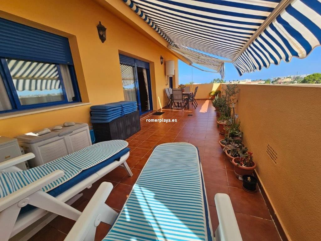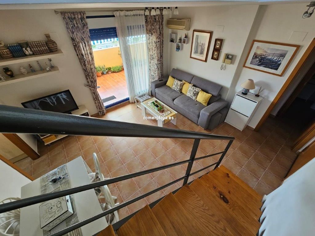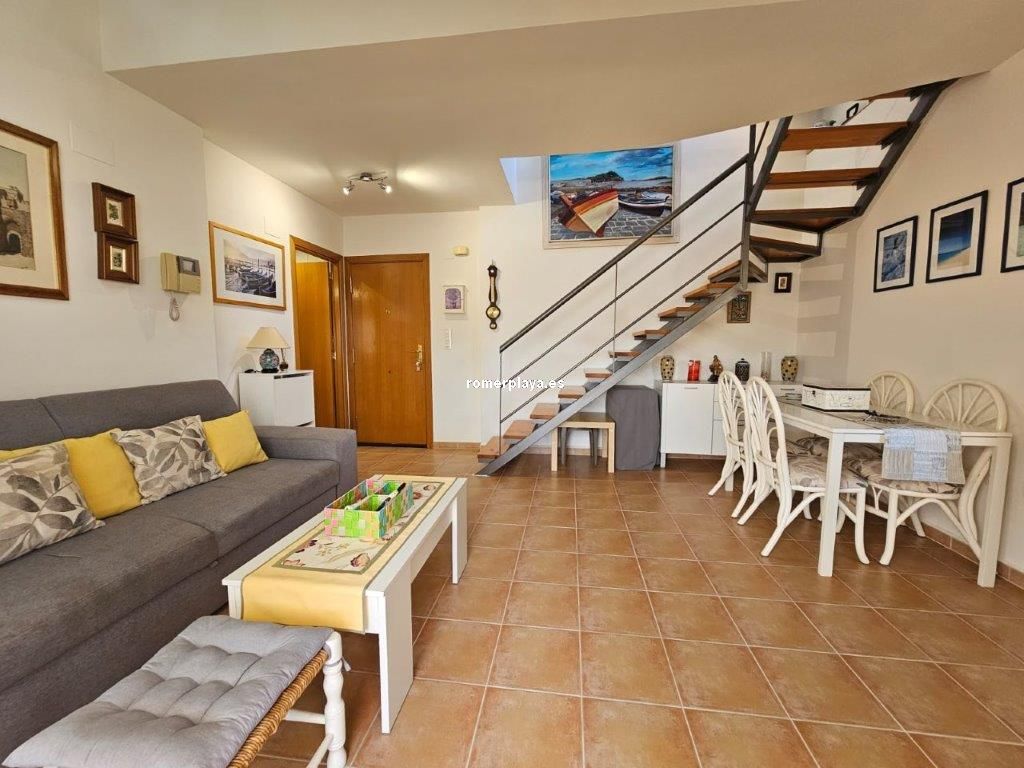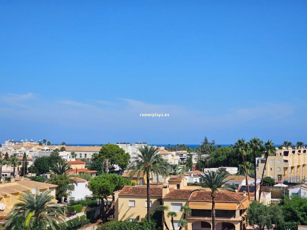 Bonito ático dúplex construido en 2004, en perfecto estado de uso y conservación. Con unas vistas 360 grados panorámicas de Denia, el Castillo, El Mar y el Montgo. La vivienda está distribuida en dos plantas, en la planta baja, disponemos de un amplio y luminoso salón comedor, cocina independiente completamente equipada, un dormitorio doble con armario empotrado y ventilador, y un baño con ducha. Desde el salón salimos a la impresionante y privada terraza de 36 metros con orientación este, con toldos, desde donde podemos disfrutar de las vistas. A través del salón comedor y por unas cómodas escaleras accedemos a la parte alta de la vivienda donde hay una gran habitación con dos generosos armarios empotrados y baño con bañera en suite. La vivienda dispone de Aire acondicionado frío calor, dispone de ascensor, acceso adaptado en todo el complejo. Incluido en el precio, dispone de una amplia plaza de parking con tejado para un vehículo. La urbanización cuenta con servicio de conserjería las 24 horas del día, además de dos piscinas (adultos y niños) baños y duchas, zonas de parking de bicicletas y una extensa zona ajardinada con arbolada y bancos. Situada a 1,5 Km de Denia y a 500 metros de la playa. A un paso de la zona de dotaciones deportivas de Denia ( campo de fútbol, trinquet, centro deportivo, piscinas cubiertas, spa, etc.). La playa es de arena fina donde podrás disfrutar de su agua cristalina y paseos por la orilla del mar. La zona cuenta con todo tipo de servicios todo el año, supermercados, restaurantes, etc.