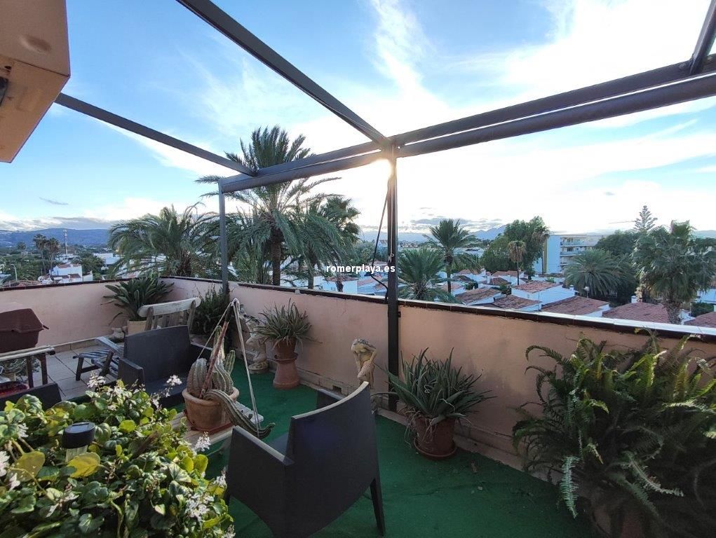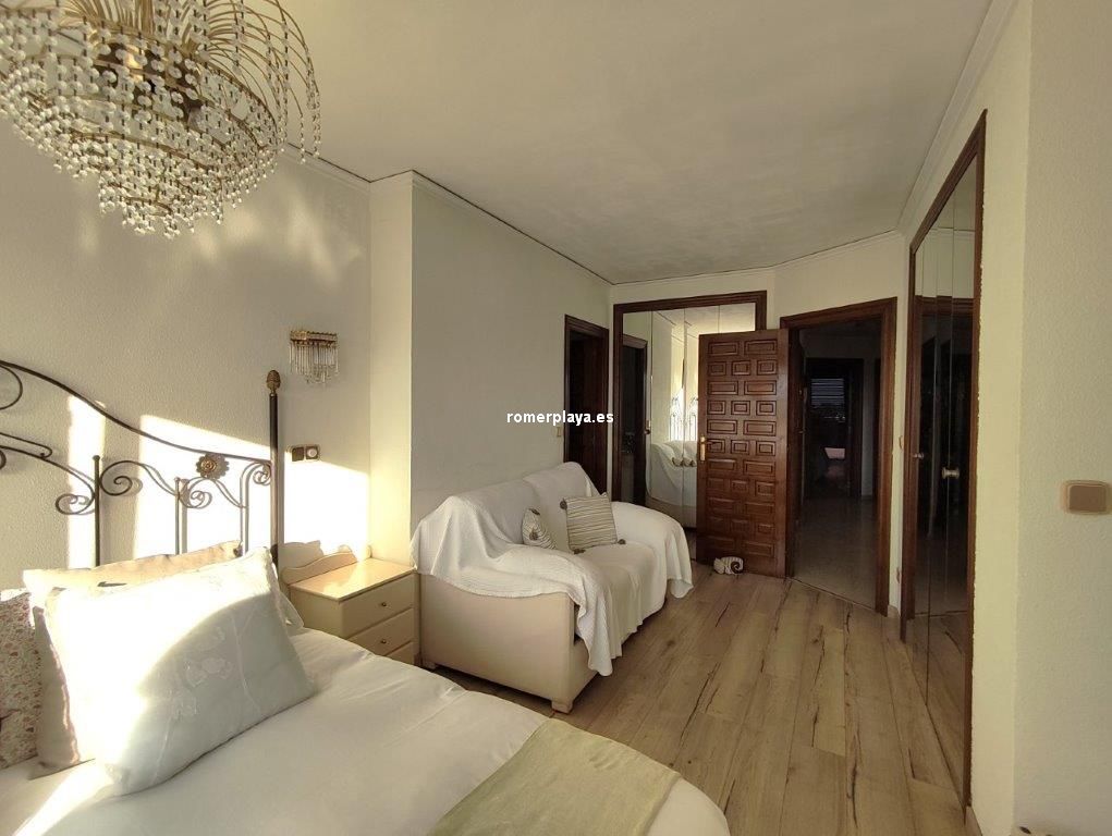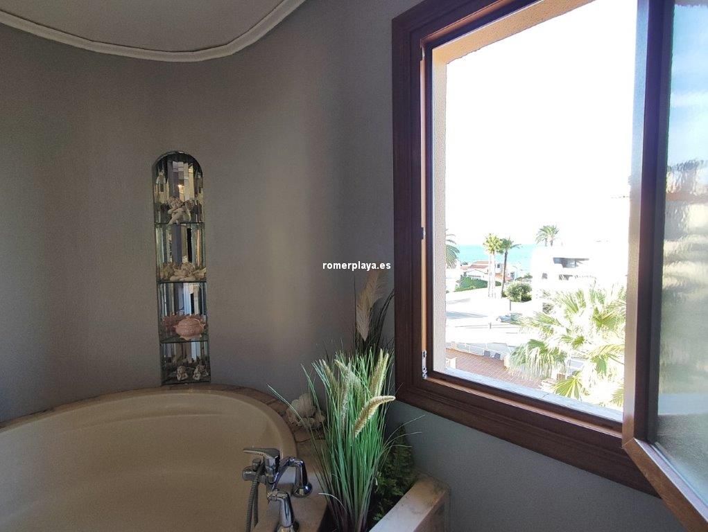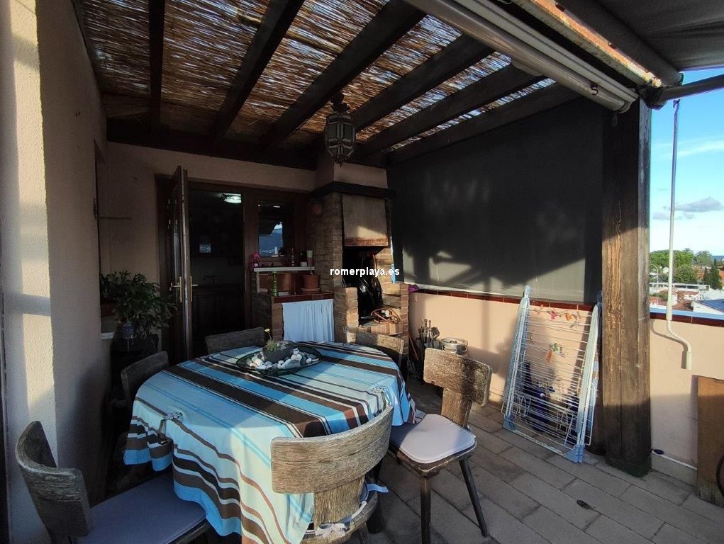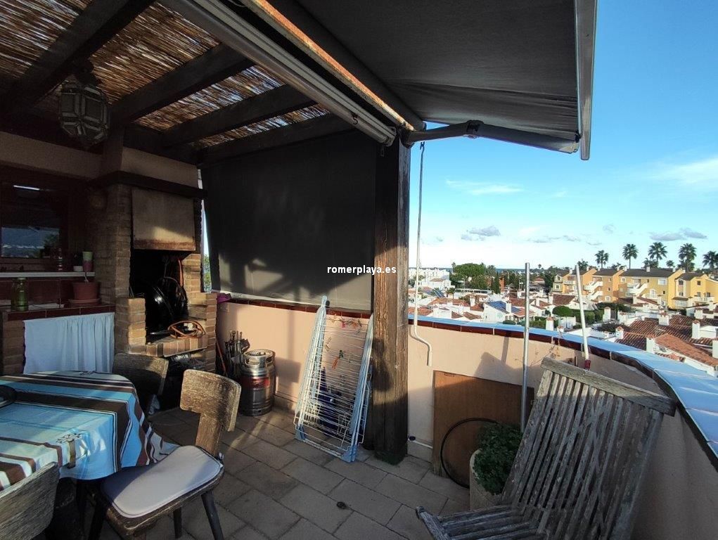 Ático en km 2,5 de las marinas a 100 metros de la playa, junto a supermercados y restaurantes, la vivienda en 3ª planta sin ascensor con 128m vivienda mas 54m de terrazas, está distribuida en dos habitaciones dobles con armarios empotrados y sus baños correspondientes en suitte , salón comedor con chimenea y cocina americana con salida a la gran terraza que da la vuelta a la casa, con lo que se puede entrar y salir desde el comedor y la cocina, ventanas de doble climalit y A/A F/C , la urbanización , piscina, jardín, parking comunitario.