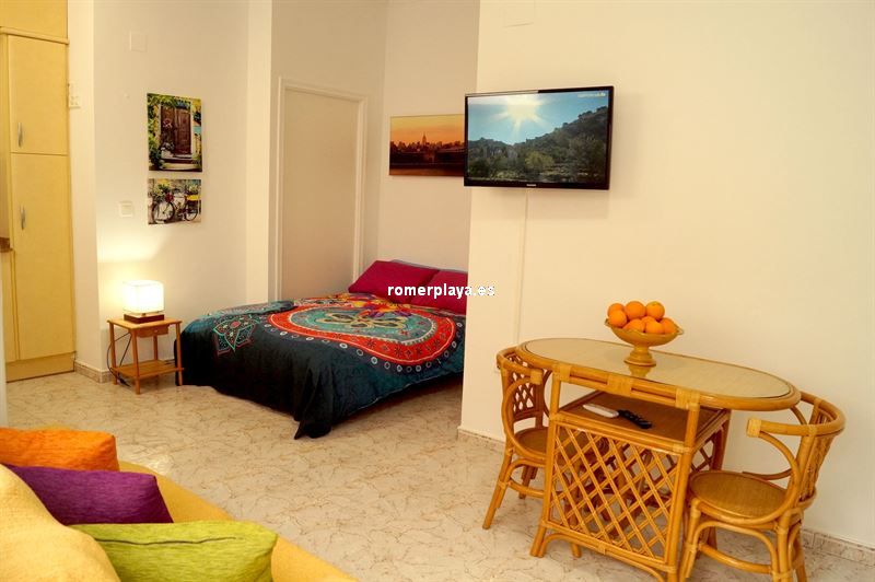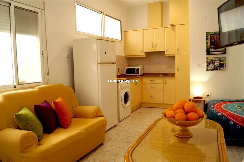 Estudio amarillo, 22 mts aprox, cocina, 1 baño, aire acondicionado. Puerta y ventanas de aluminio.