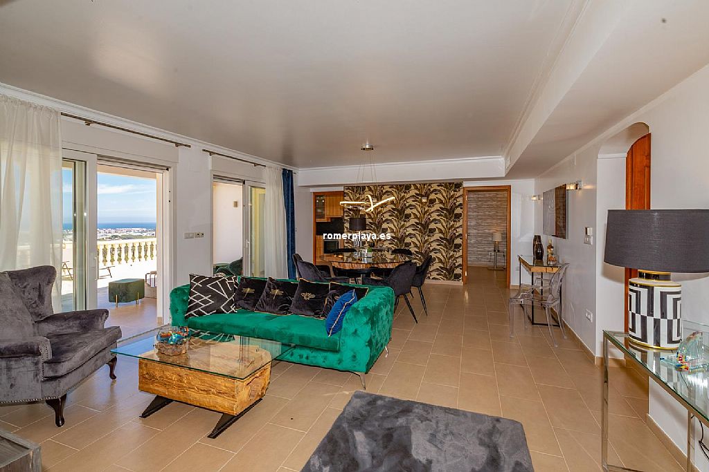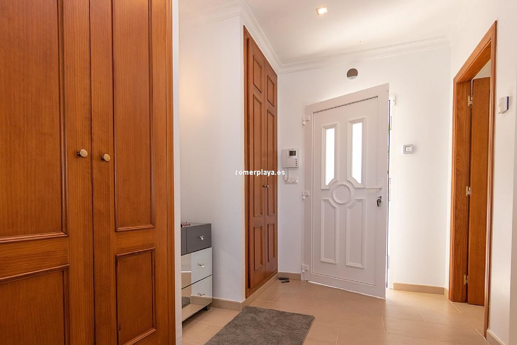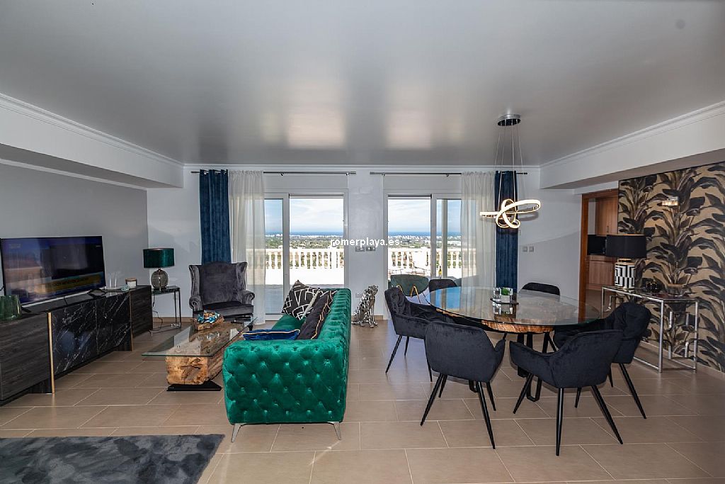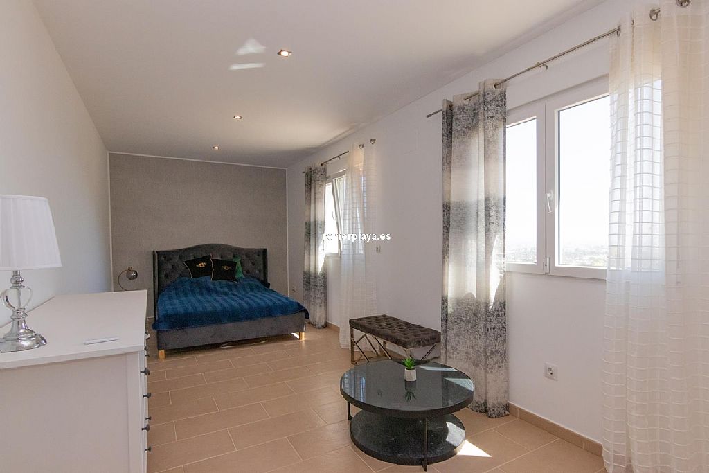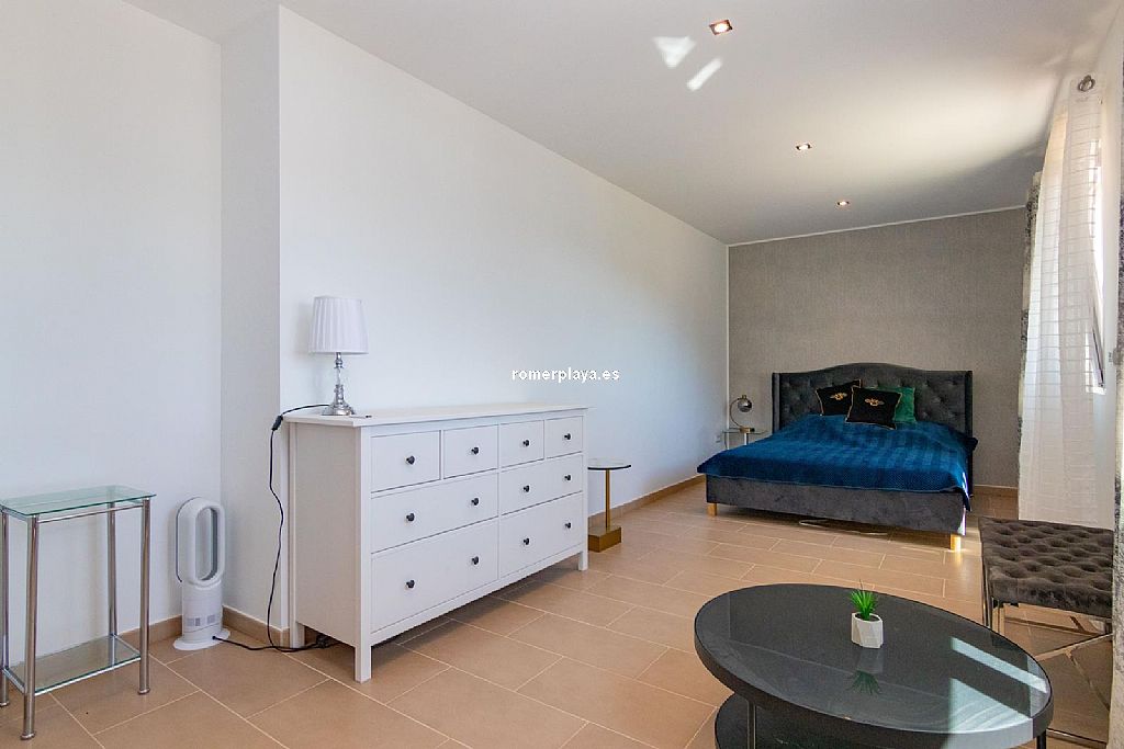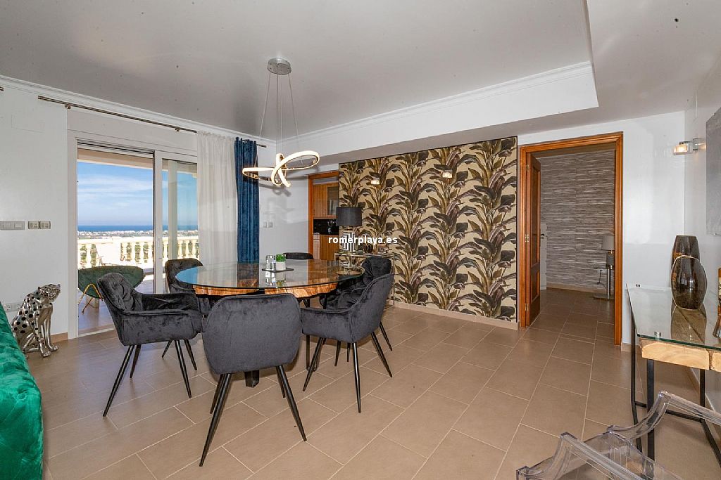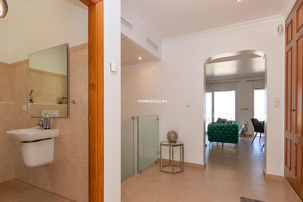 La planta principal de la vivienda está distribuida en un amplio salón-comedor con salida a una impresionante terraza de 130 m2 parcialmente cubierta, una cocina separada con lavadero/despensa y salida a la terraza, 2 dormitorios amplios, uno de ellos con vestidor, 2 baños en suite (uno con ducha y otro con bañera) y un aseo. Tanto el salón como la cocina y el dormitorio principal tienen vistas al mar. Toda la planta superior está equipada con suelo radiante y aire acondicionado vía conductos. Las ventanas son de PVC, la mayoría de ellas con triple acristalamiento y con persianas automáticas.