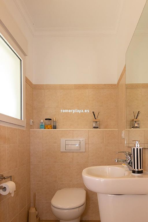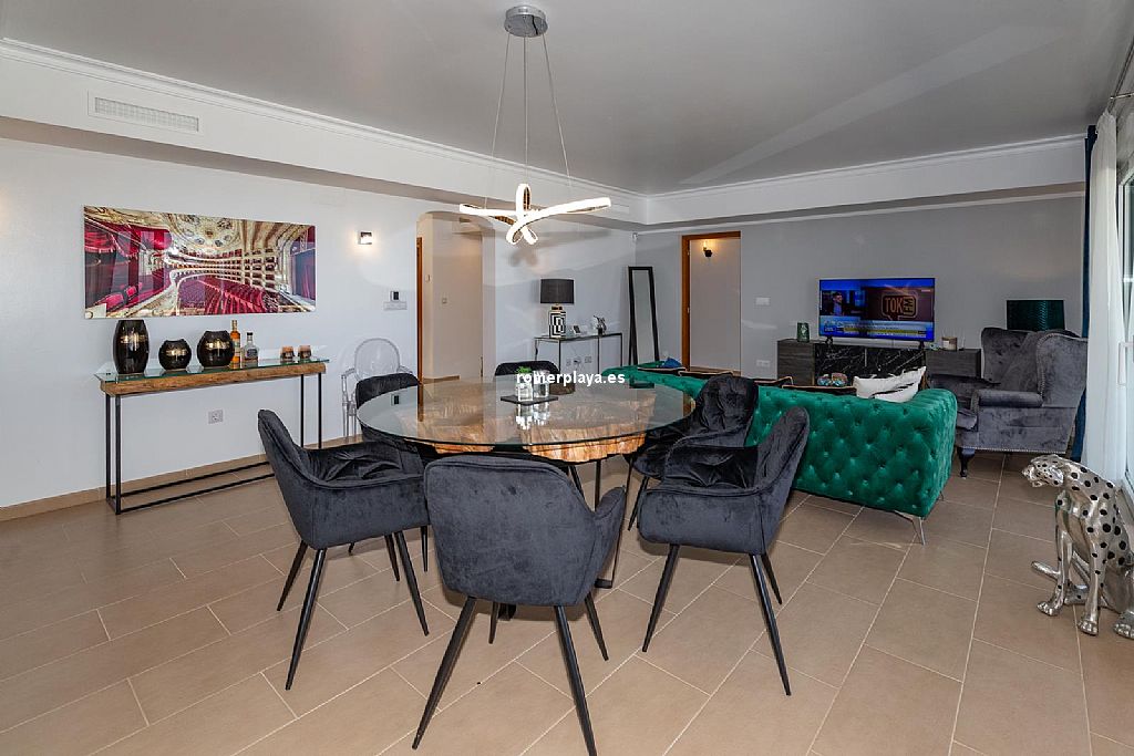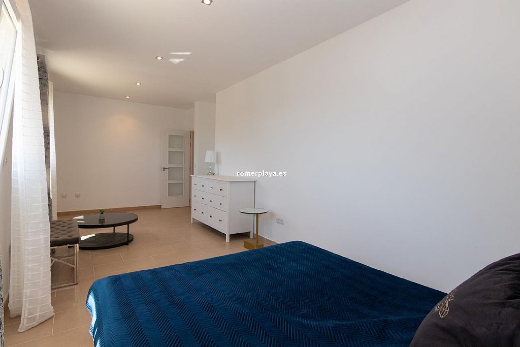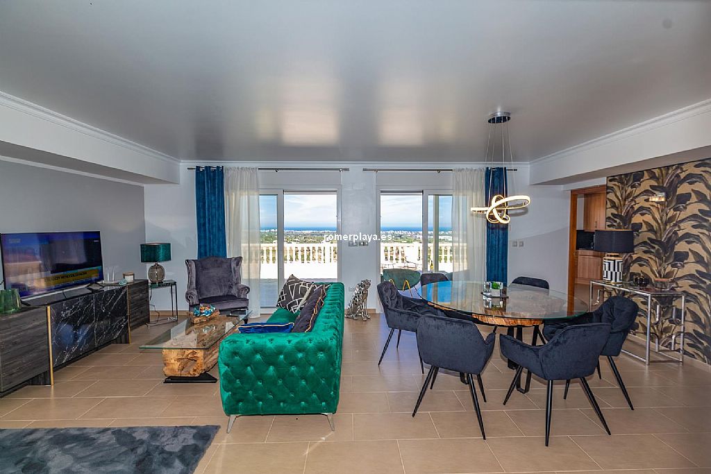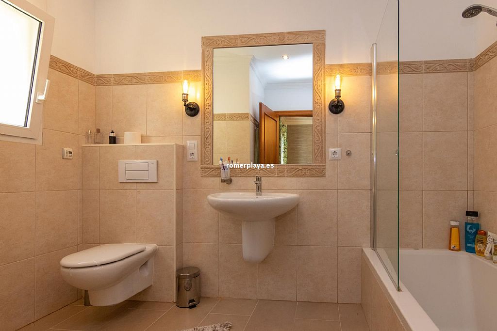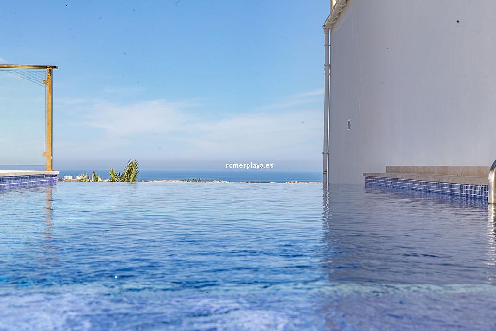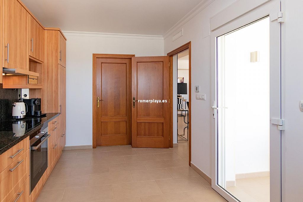 La planta principal de la vivienda está distribuida en un amplio salón-comedor con salida a una impresionante terraza de 130 m2 parcialmente cubierta, una cocina separada con lavadero/despensa y salida a la terraza, 2 dormitorios amplios, uno de ellos con vestidor, 2 baños en suite (uno con ducha y otro con bañera) y un aseo. Tanto el salón como la cocina y el dormitorio principal tienen vistas al mar. Toda la planta superior está equipada con suelo radiante y aire acondicionado vía conductos. Las ventanas son de PVC, la mayoría de ellas con triple acristalamiento y con persianas automáticas.