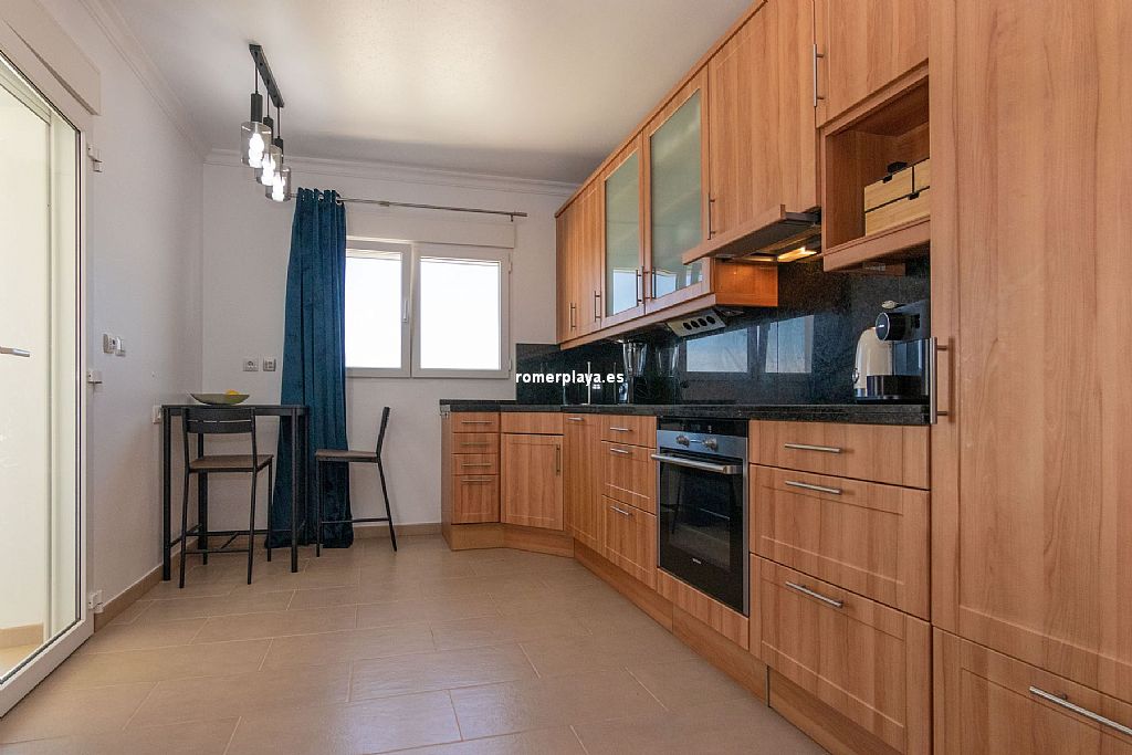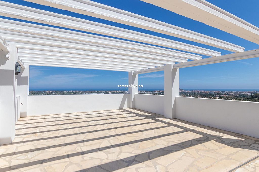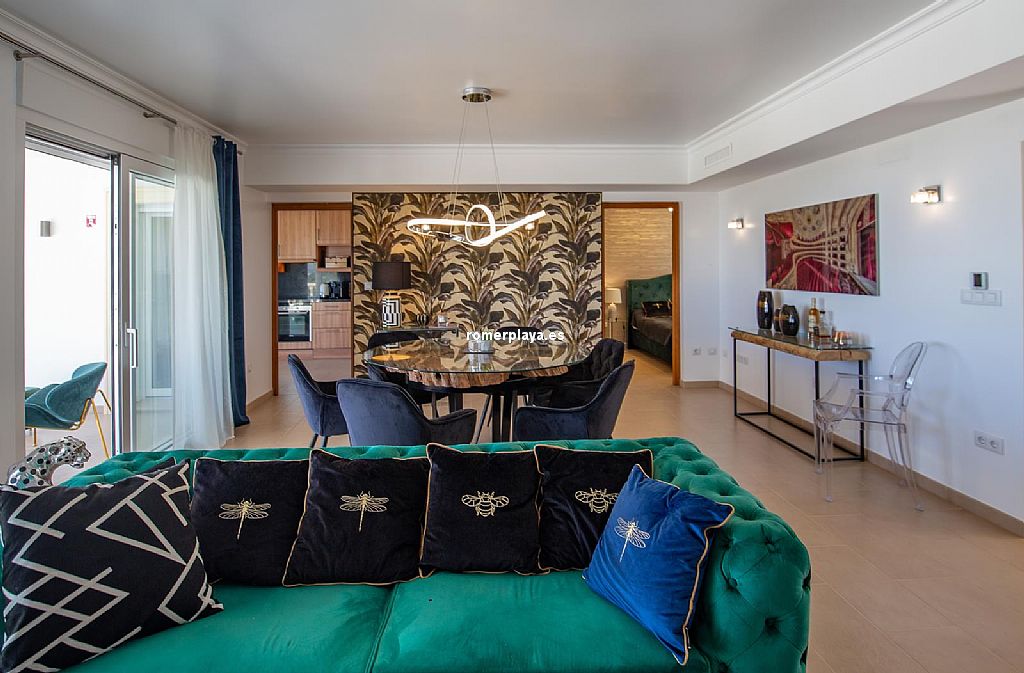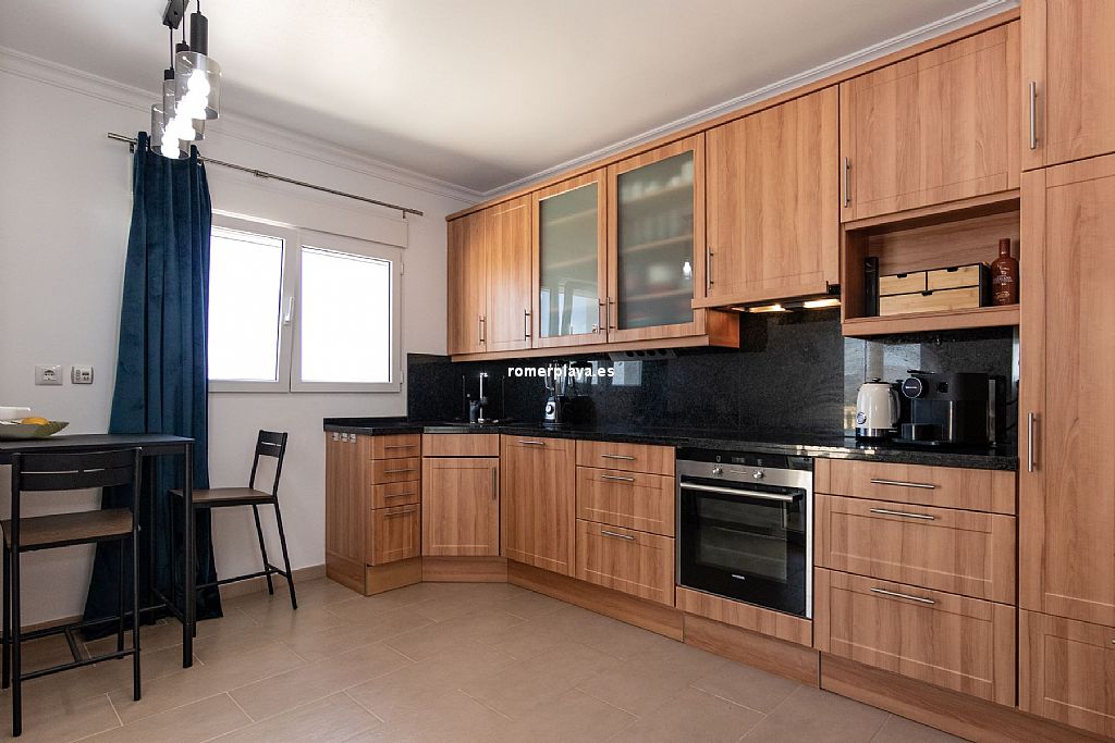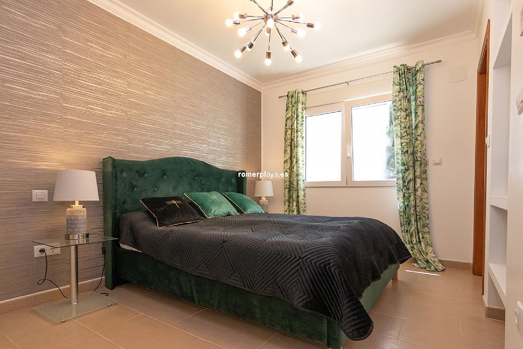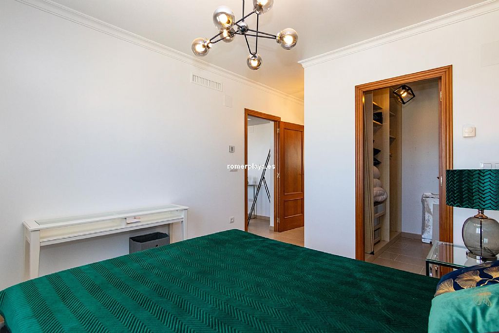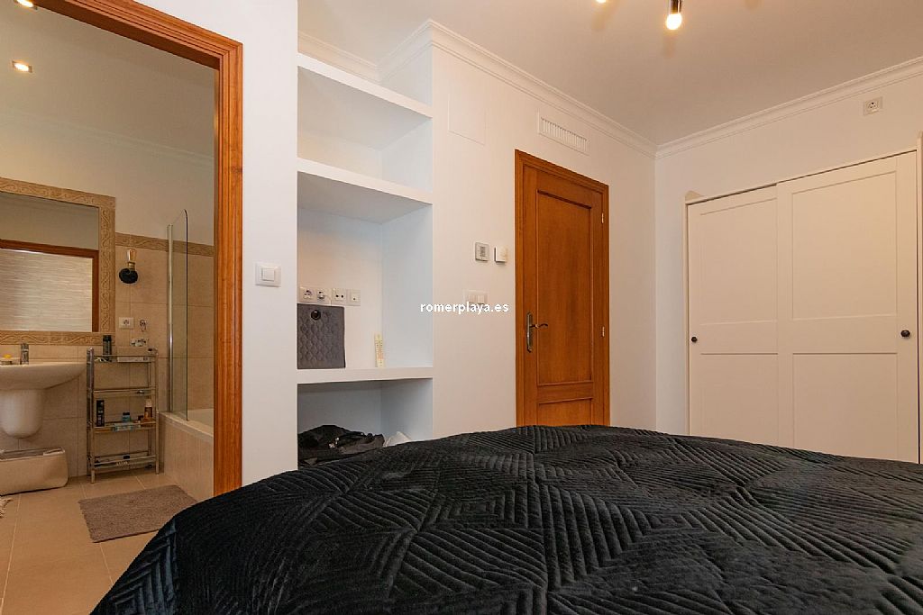 La planta principal de la vivienda está distribuida en un amplio salón-comedor con salida a una impresionante terraza de 130 m2 parcialmente cubierta, una cocina separada con lavadero/despensa y salida a la terraza, 2 dormitorios amplios, uno de ellos con vestidor, 2 baños en suite (uno con ducha y otro con bañera) y un aseo. Tanto el salón como la cocina y el dormitorio principal tienen vistas al mar. Toda la planta superior está equipada con suelo radiante y aire acondicionado vía conductos. Las ventanas son de PVC, la mayoría de ellas con triple acristalamiento y con persianas automáticas.