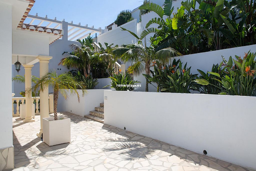 Desde la piscina desbordante de 3,80 x 9,50 m con su jacuzzi integrado, tomando el baño rodeado de burbujas se puede contemplar el agua fundiéndose con el cielo y el mar. Hay una preinstalación de climatización para poder disfrutar también de la piscina durante los meses más fríos. En el parking con puerta corredera y pérgola pueden estacionar dos coches. Debajo del parking se encuentra una espacio todavía sin acabar que ofrece múltiples posibilidades de uso, como por ejemplo gimnasio, sauna, estudio de pintura,...... instalando unas grandes ventanales se podría disfrutar de mucha luz natural y vistas mágicas. Desde el parking unas escaleras bajan a la entrada de la casa. En esta zona nos encontramos un pequeño jardín tropical con sistema de riego.