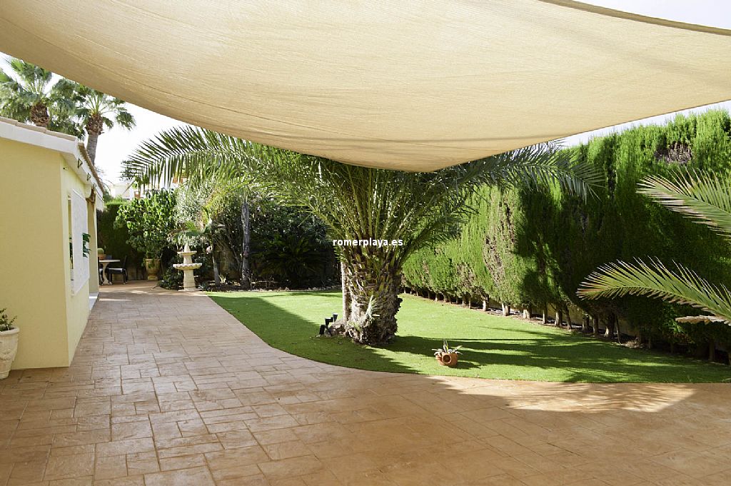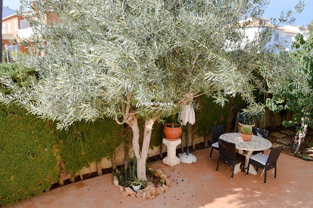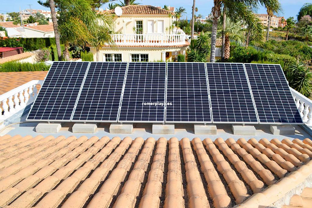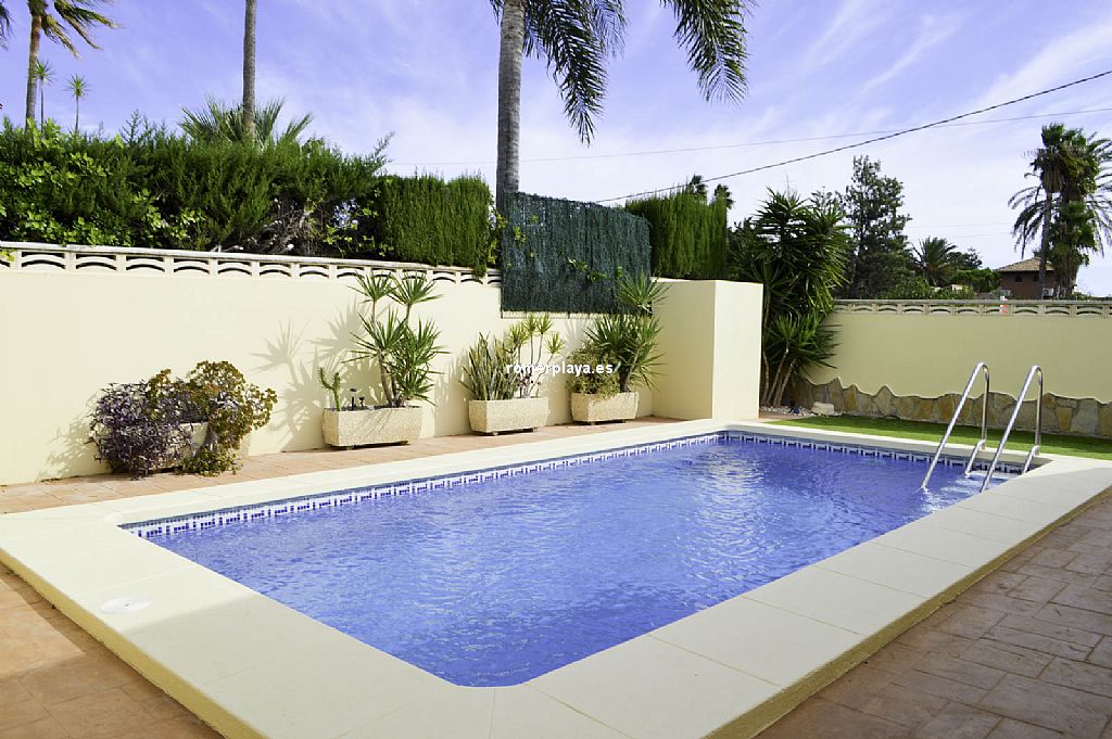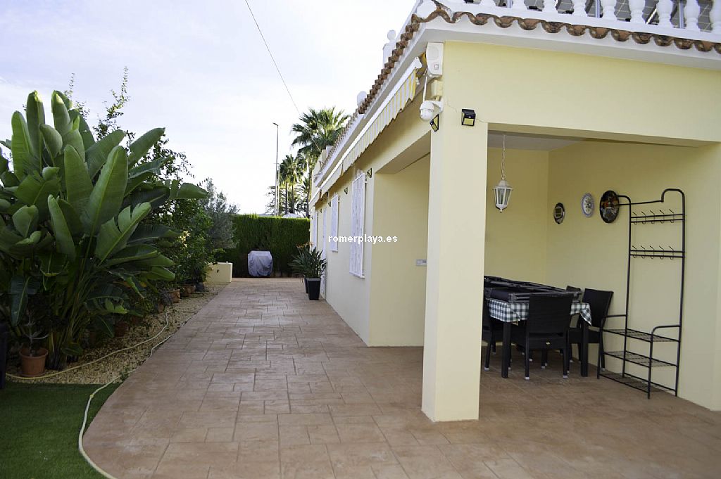 Chalet unifamiliar independiente de 4 dormitorios a un paso de playa de arena, en la zona de Las Brisas. La vivienda, construida toda en una planta, cuenta con una superficie total construida de 121,62 m2 distribuidos en 4 dormitorios, 2 baños (1 en suite), salón-comedor, cocina, lavadero, trastero cerrado y 2 terrazas cubiertas con diferentes orientaciones. Mediante escalera exterior tenemos acceso a un amplio solarium con preciosas vistas al Montgó y los alrededores. Con buenas calidades de construcción, la vivienda ha sido recientemente renovada. Toldos con sensores de viento, ventanas con doble cristal, luces led exteriores con sensor de movimiento, ventiladores techo, aire acondicionado (frío y calor), placas solares, calefacción de gas, ... Está construida sobre una parcela de 623,50 m2, totalmente llana y esquinera con mucha privacidad. Piscina independiente, ducha con agua caliente, toldos con sensor de viento, pozo para riego, parking techado para 2 coches con puerta corredera automática. Ubicada en una de las zonas más cotizadas de la playa de Dénia, en la zona del Centro Comercial Las Brisas a escasos 3 kms. del centro del pueblo y que cuenta con todo tipo de servicios abiertos todo el año: farmacia, supermercado, restaurantes, tiendas, ... Con parada de autobús cerca. Una vivienda ideal para veranear, pasar largas temporadas e incluso como vivienda habitual.