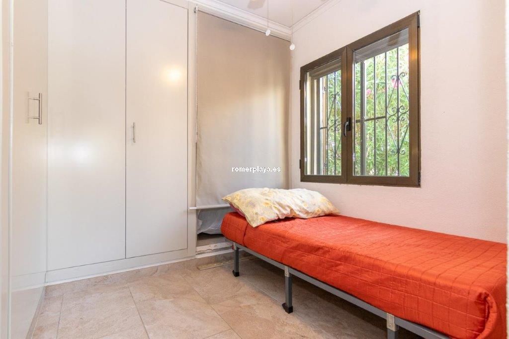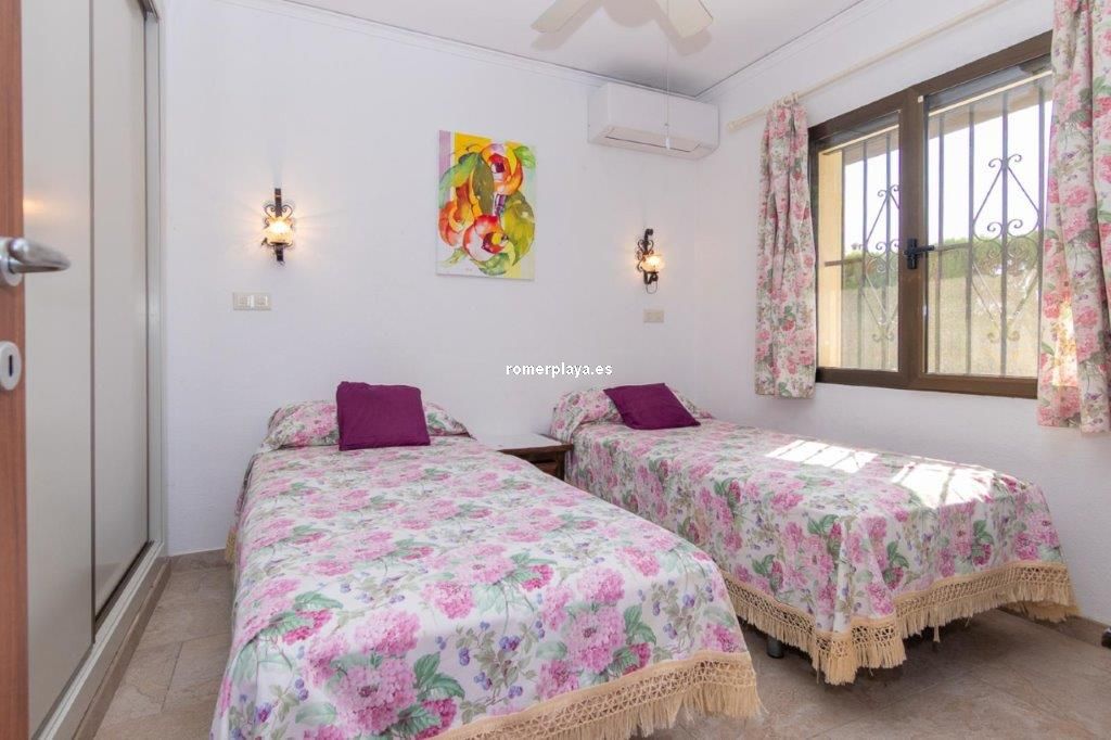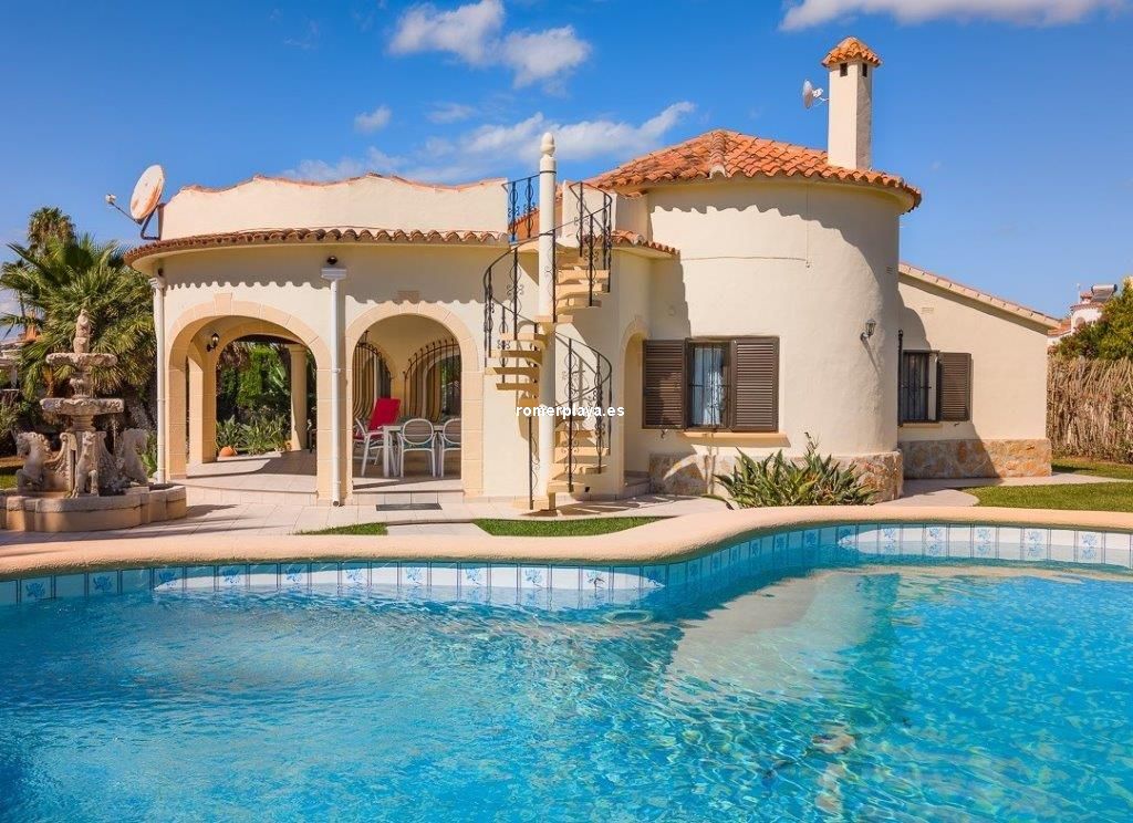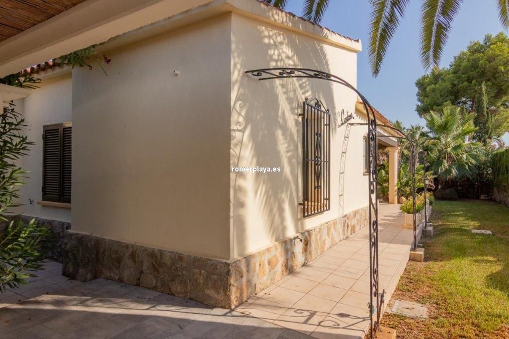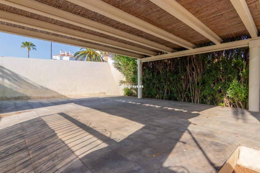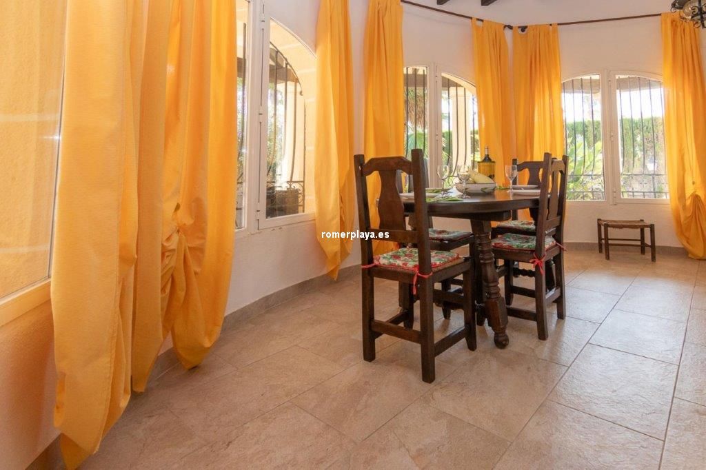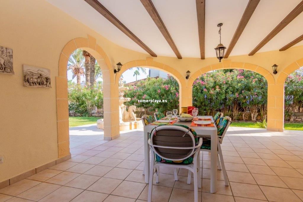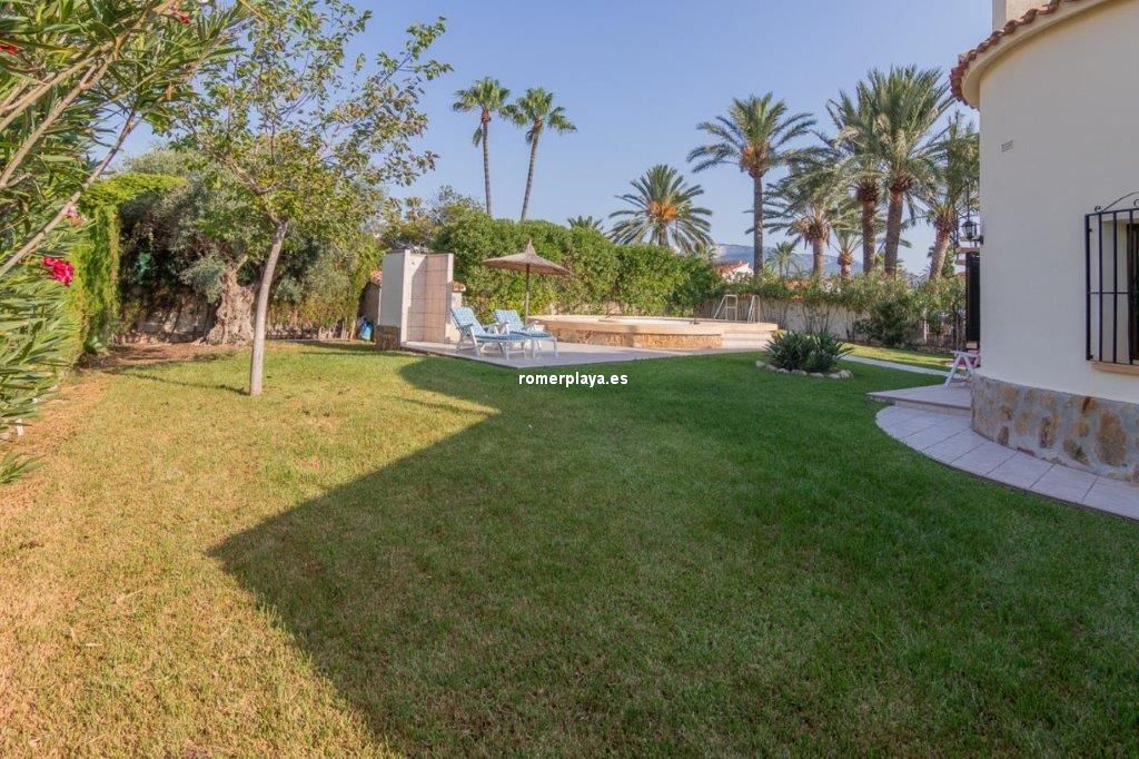 Escapa de la rutina… date el capricho de vivir en un chalet junto al mar en Las Marinas de Dénia A solo 250 m de la playa y 2,5 km del centro de Dénia, se encuentra esta impecable casa construida sobre una parcela llana y esquinera de 832 m². Una ubicación privilegiada que combina privacidad, comodidad y tranquilidad en una de las zonas más deseadas de la ciudad. Interior y distribución Con 160 m² construidos (112 m² vivienda y 48 m² de terraza cubierta) en una sola planta, la vivienda está pensada para el confort diario. El salón acogedor y luminoso, con chimenea abierta, conecta directamente con una terraza acristalada utilizada actualmente como comedor, desde la cual se accede a la cocina de diseño totalmente renovada. Tanto la cocina como el salón enlazan con un pasillo distribuidor. Este pasillo conduce a la zona de descanso, actualmente con 2 dormitorios, aunque en origen la vivienda contaba con 3. Uno de ellos se integró en el dormitorio principal para crear un vestidor, transformándolo en una suite amplia y confortable. La casa dispone además de un baño con ducha de generosas dimensiones, armarios empotrados en dormitorios y comedor, así como un lavadero-trastero muy práctico. Exterior La joya de la casa es la amplia terraza cubierta, un espacio único donde podrás relajarte, disfrutar de comidas al aire libre sin preocuparte por el sol o la lluvia, y disfrutar de las vistas al jardín y la piscina. Este rincón se convertirá sin duda en tu lugar favorito. El jardín mediterráneo, con vegetación madura, un valioso olivo, una impresionante fuente y distintos rincones de descanso, es un auténtico oasis. La propiedad dispone de agua de red y pozo propio para el riego y la piscina privada, junto a la cual se encuentran una ducha exterior y una soleada terraza ideal para relajarse. Además, la casa ofrece un trastero exterior integrado, parking cubierto para dos vehículos y un solárium. Extras y posibilidades Ventanas de aluminio con doble acristalamiento, termo eléctrico de 100 l y un proyecto arquitectónico existente para un dormitorio adicional en la planta superior aumentan aún más el atractivo de esta propiedad. A pocos minutos andando de restaurantes y supermercados. El reconocido restaurante de Quique Dacosta (3 estrellas Michelin) está a solo 5 minutos a pie, y el club de tenis se encuentra igualmente cerca. ¿Te imaginas viviendo en esta casa junto al mar en Dénia? Llámanos y ven a visitarla: te encantará.