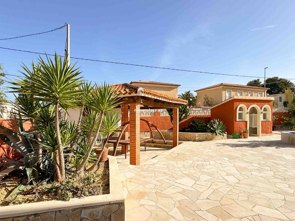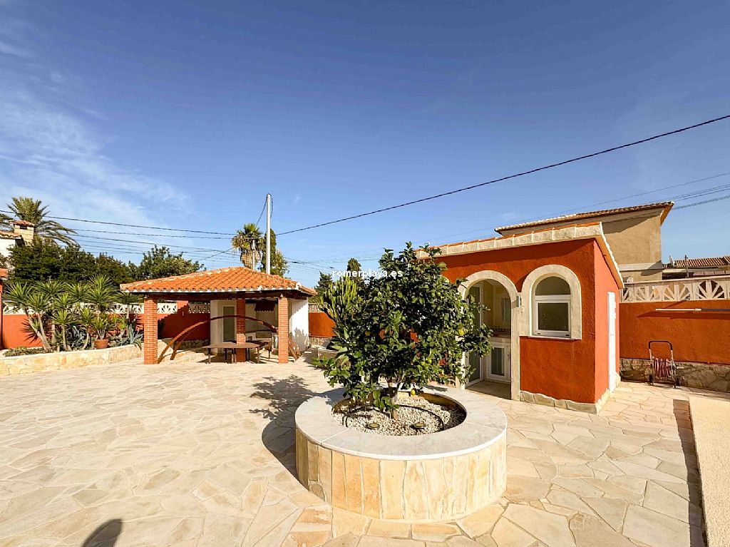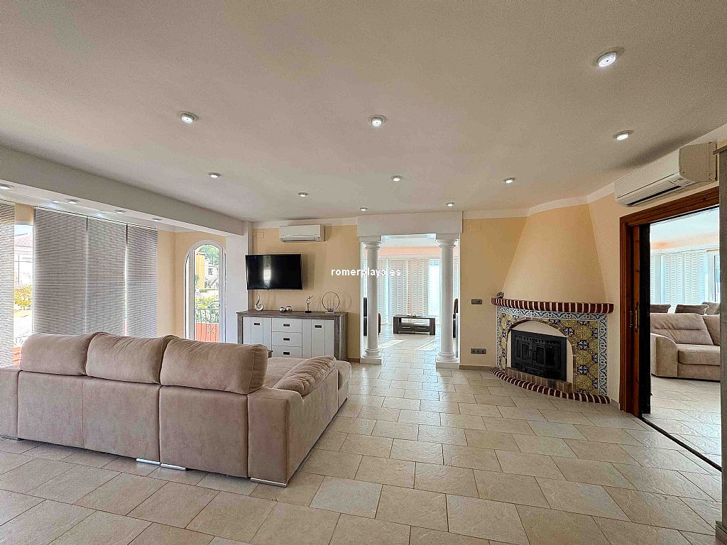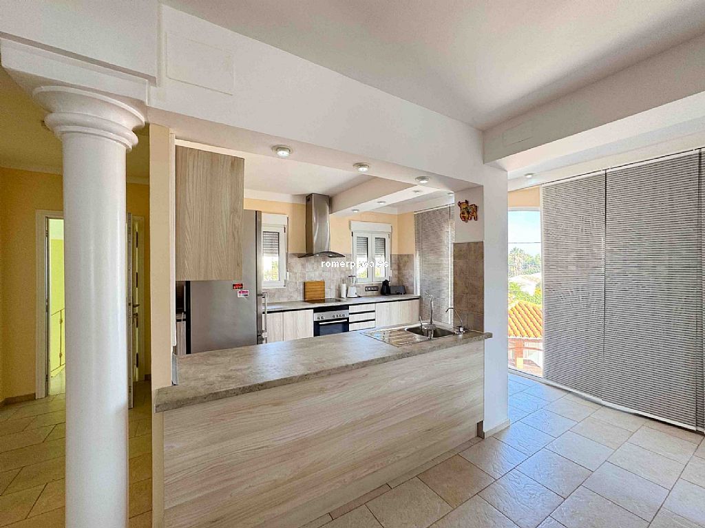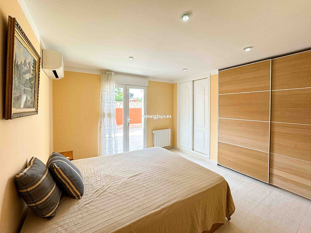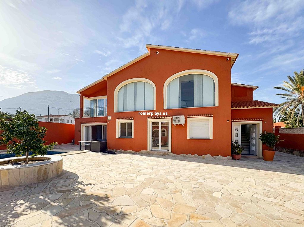 Villa privada con piscina situada en una tranquila zona a 1,5 km de la playa de Las Rotas y 3 km del centro de Denia. La casa consta de dos alturas y destaca por su amplitud y luminisidad. Planta baja dispone de tres dormitorios dobles en suit, con armarios, calefacción y aire acondicionado. La cocina está equipada con electrodomesticos, tiene aire acindicionado y su propio acceso al patio, el salon comedor se comunica con la terraza exterión y la piscina. En la planta primera se encuentra una gran salon comedor con chimenea, terraza con vistas a la montaña, sala de juegos, espacio de lectura, cocina, un dormitorio con baño y un aseo. Todas las estancias incluido la terraza tienen a/a y calefacción central de gas, están instaladas placas solares. La parte exteriór nos ofrece privacidad y comodidad, la piscina es de 10x5, tiene una casita con ducha y aseo, un cenador con mesa de comedor, a parte hay una lavandería con armarios altos para almacenamiento.