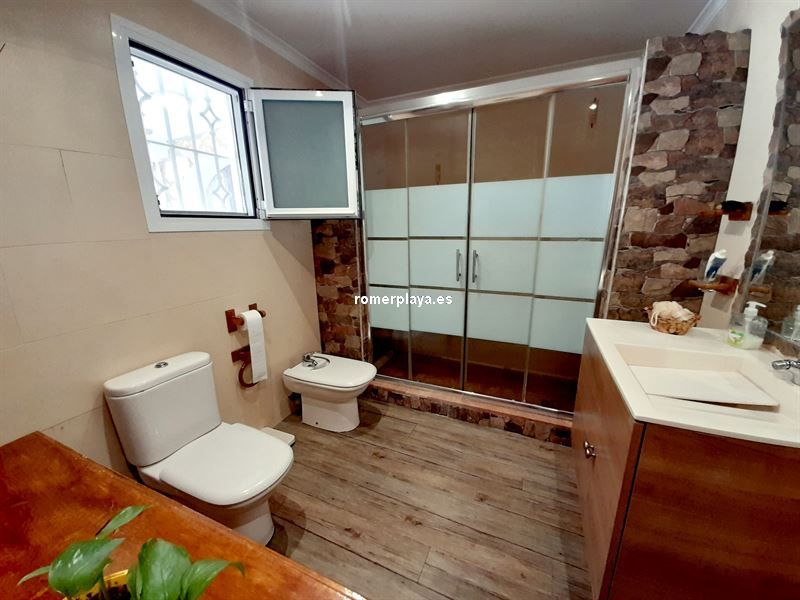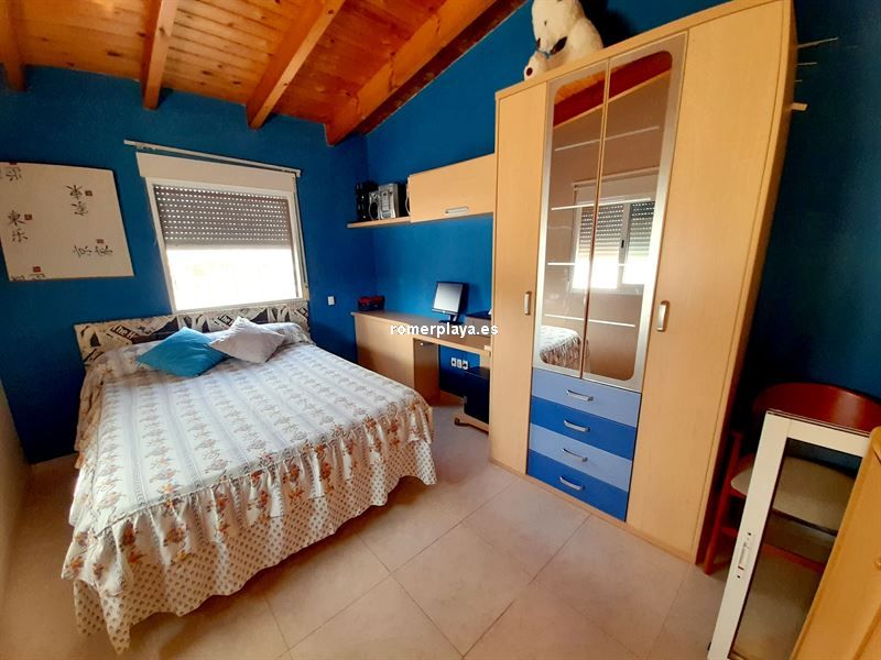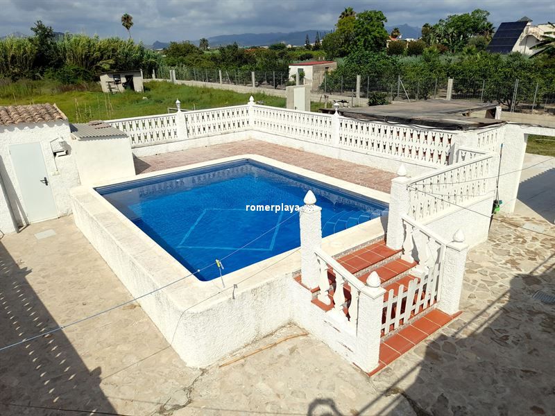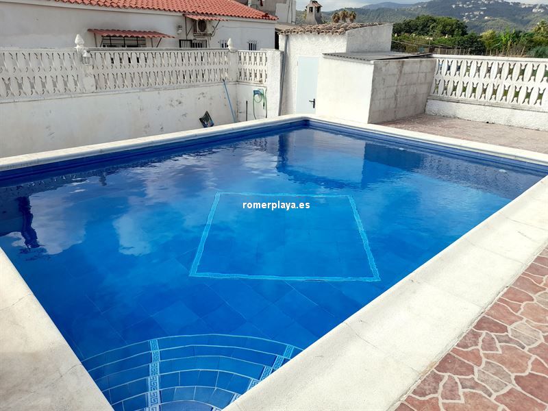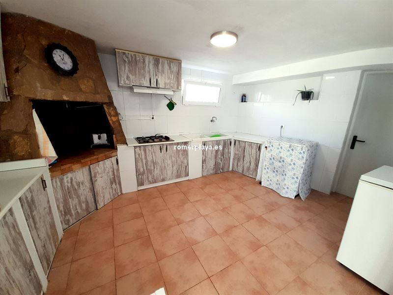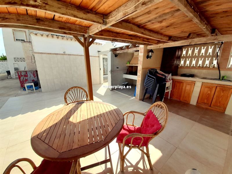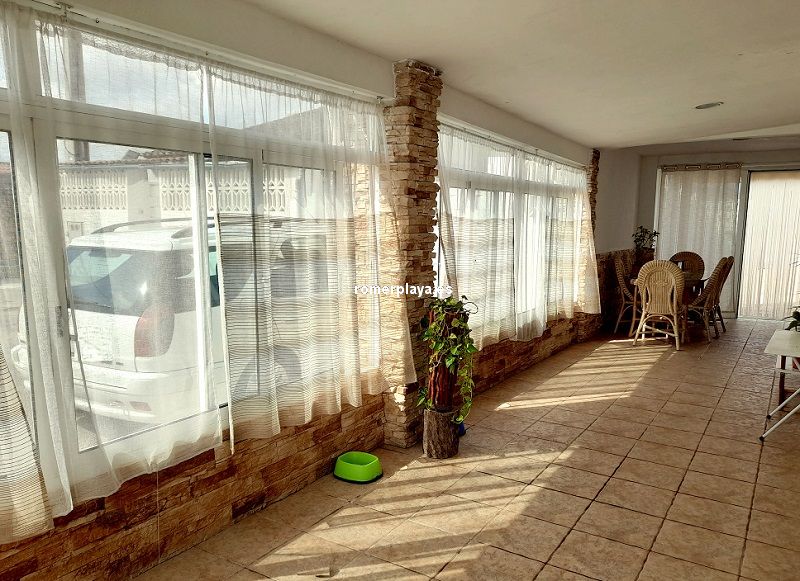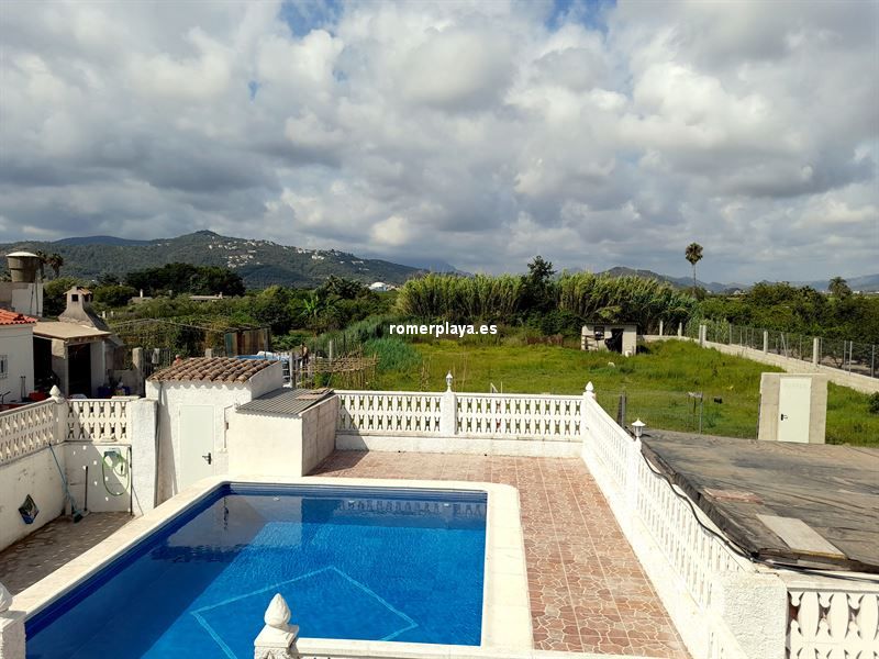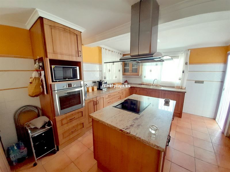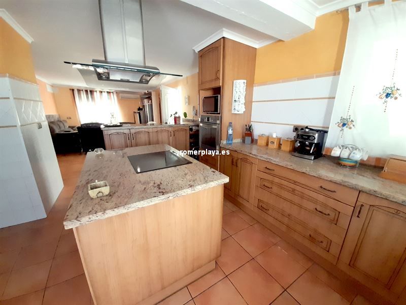 Chalet de dos plantas con 382 m2 de la casa y 2400 m2 de parcela. Planta baja: A la casa acedemos por terraza acristalada con ventanas climalit, a la izquierda puerta al salón comedor con cocina abierta con isla y barra. En la misma planta encontramos un dormitorio y un baño completo con plato de ducha, cocina de verano con puerta al patio interior con piscina con amplias vistas a la montaña. Piscina de 6x5 metros. Baño exterior. En la planta primera hay tres dormitorios, un baño con plato de ducha y salida a la terraza. En la parcela hay una zona de huerto, barbacoa con pérgola de madera, cochera y patio para aparcar varias coches. Casa construida con aislamiento térmico.Ventanas climalit. Todas habitaciones con aire accondicionado F/C. Luz de red, agua de aguja de profundidad. Distancia al mar 1 km.