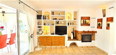 La vivienda se distribuye en una planta con 3 dormitorios dobles con armarios empotrados, 2 baños completos con plato de ducha, cocina tipo americana, salón comedor con chimenea y salida a porche cubierto y acristalado, y terraza abierta con pérgola.