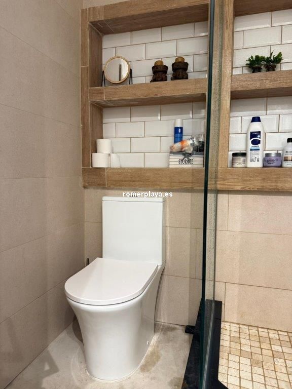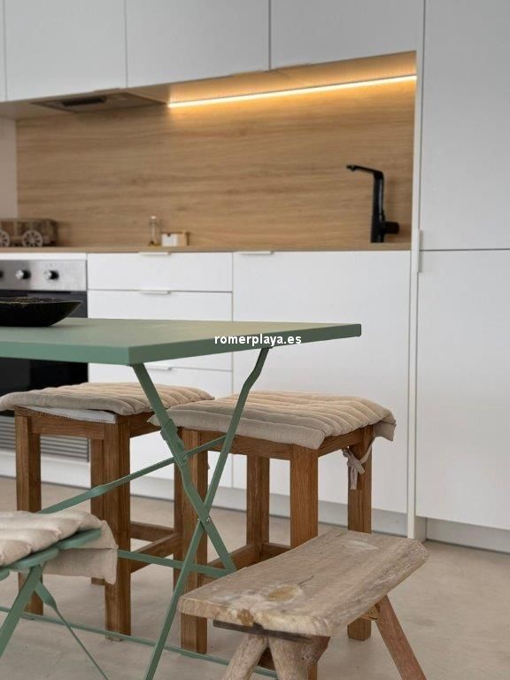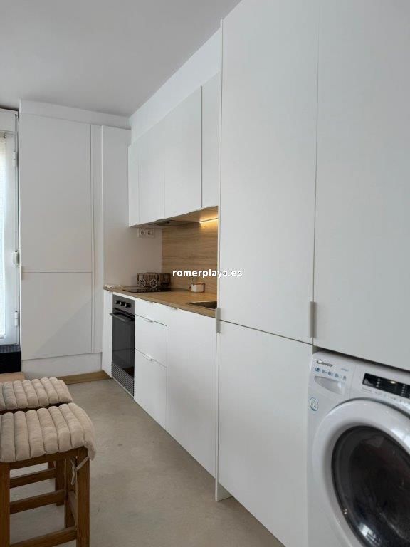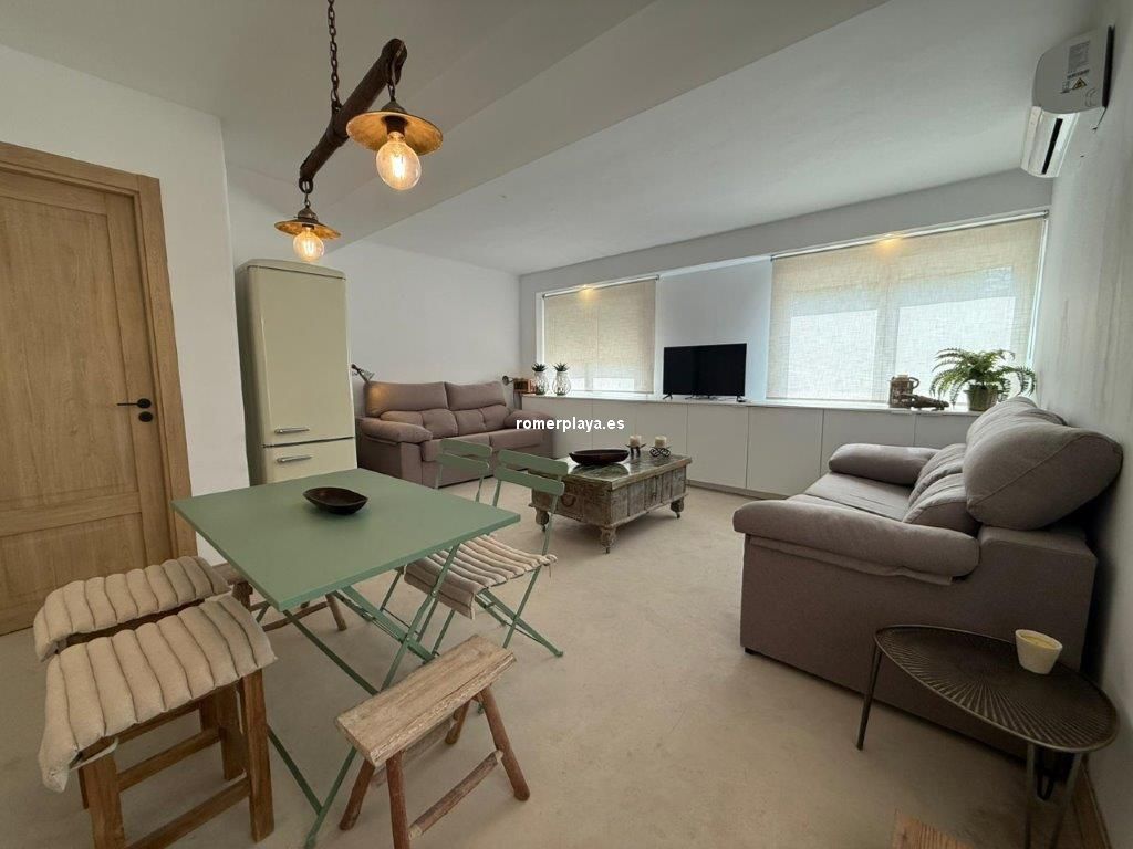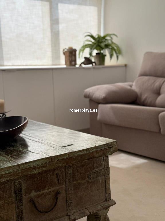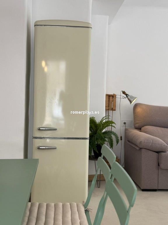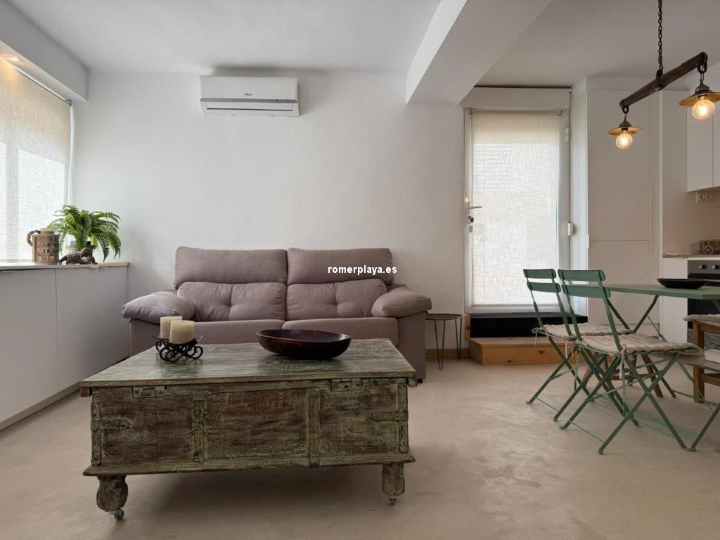 Estudio de 40 metros en planta baja, cómodo diáfano y aprovechado cada rincón, fue totalmente reformado en el 2023, tiene mucha armariada, baño con ducha y cocina abierta, dos sofás con camas de 1,50, está ubicada en urbanización con salida a la playa, cerca de restaurantes, chiringuito de playa, farmacia y parada de bus, en km5 de las marinas, la urbanización tiene mucha arbolada, jardín, juegos para niños y se ha pagado derrama para hacer piscina. Plazas de garajes comunitarias
