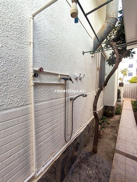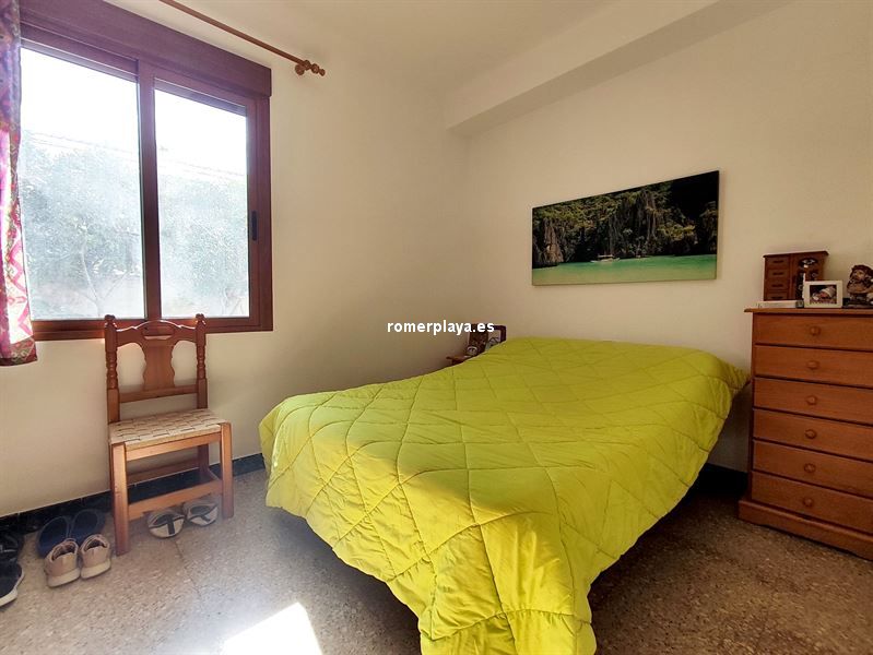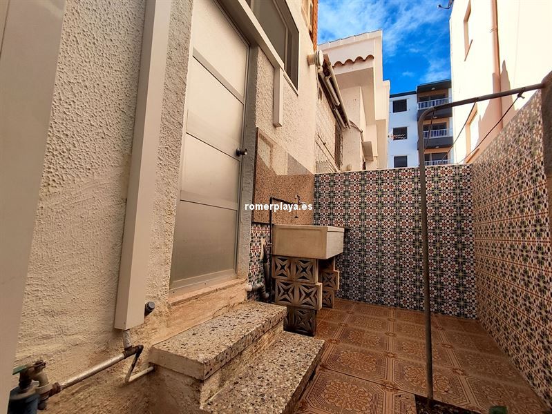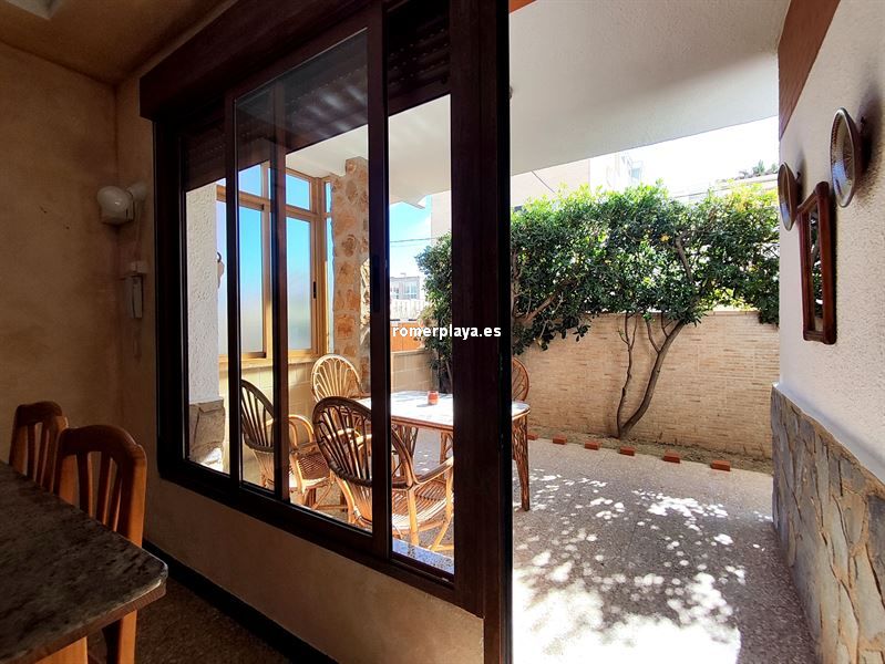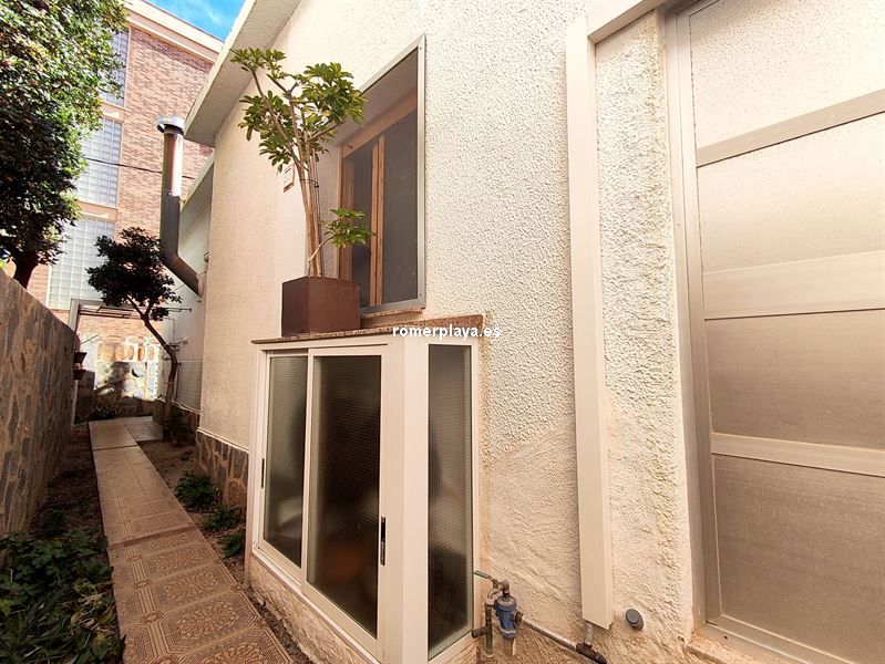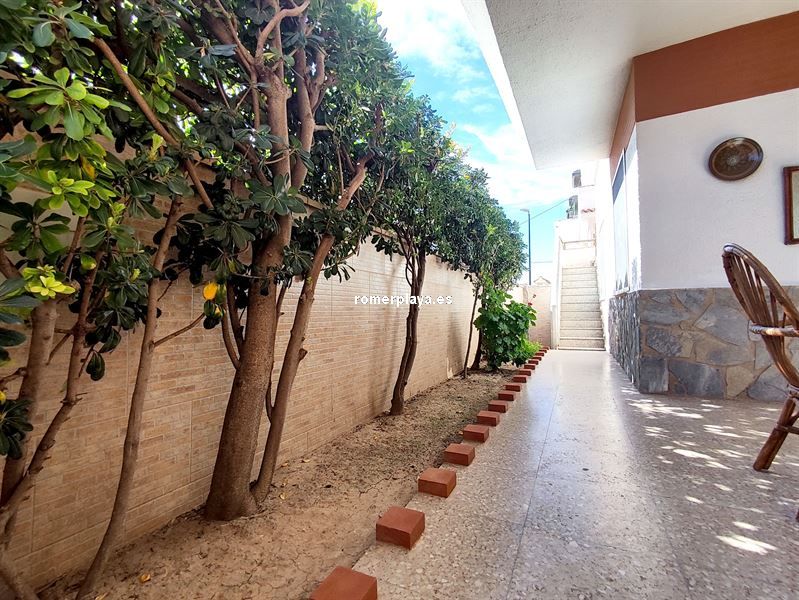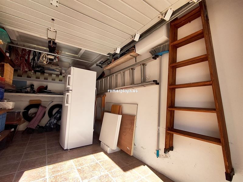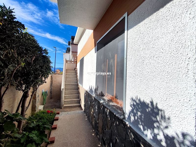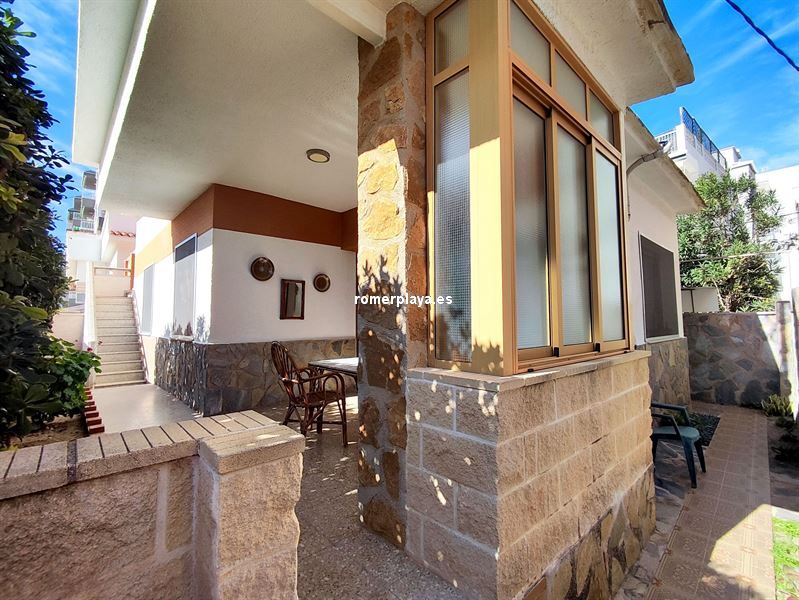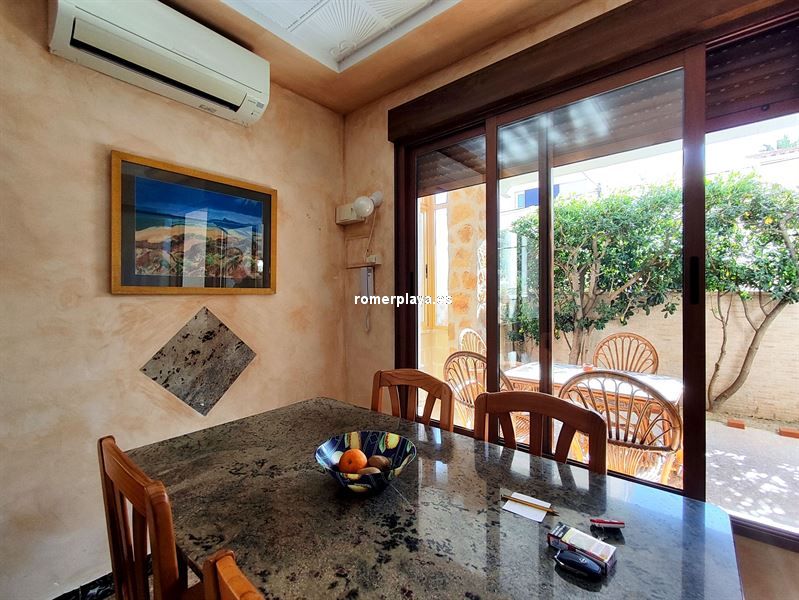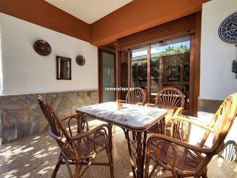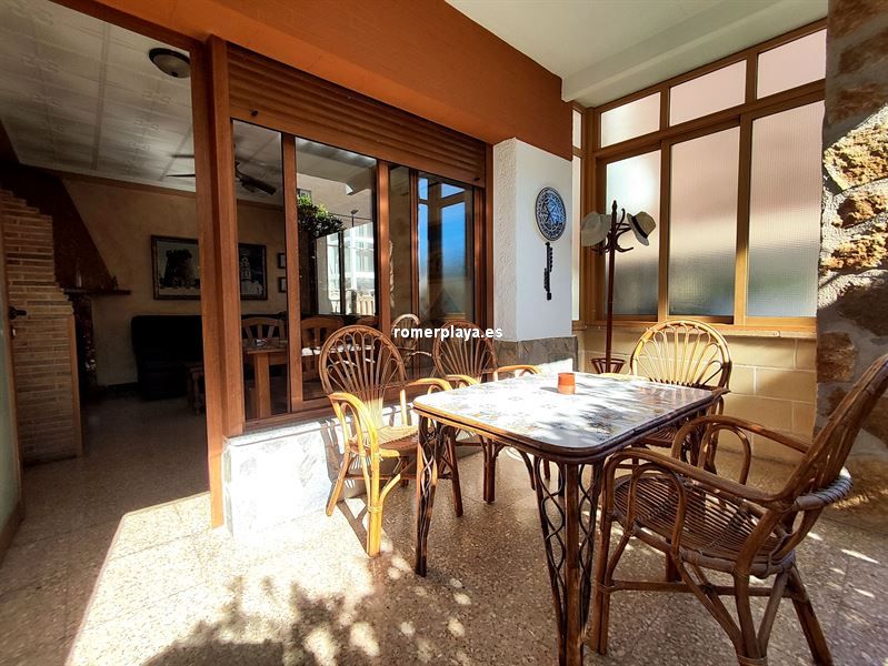 Beautiful and bright semi-detached villa built with high-quality materials, located on Piles beach just 50 metres from the Mediterranean Sea. Single-storey property, 104 square metres built on a 151 m2 plot. At the main entrance there is an outdoor terrace sheltered from the wind and sun. Next, we enter a spacious living-dining room with a fireplace and air conditioning, a separate fitted kitchen with a utility room, a toilet and access to the outdoor barbecue area. Three double bedrooms with wardrobes and a bathroom with a shower tray. Outside there is a staircase leading to the terrace with a storage room. The house is surrounded by plants and has an outdoor area with a shower. Individual closed garage with automatic door. Double glazed windows. The property is sold with furniture and appliances. Year of construction 1970. Distance to the sea only 50 metres.